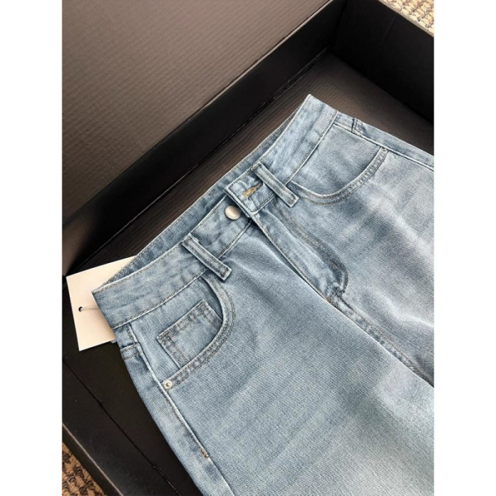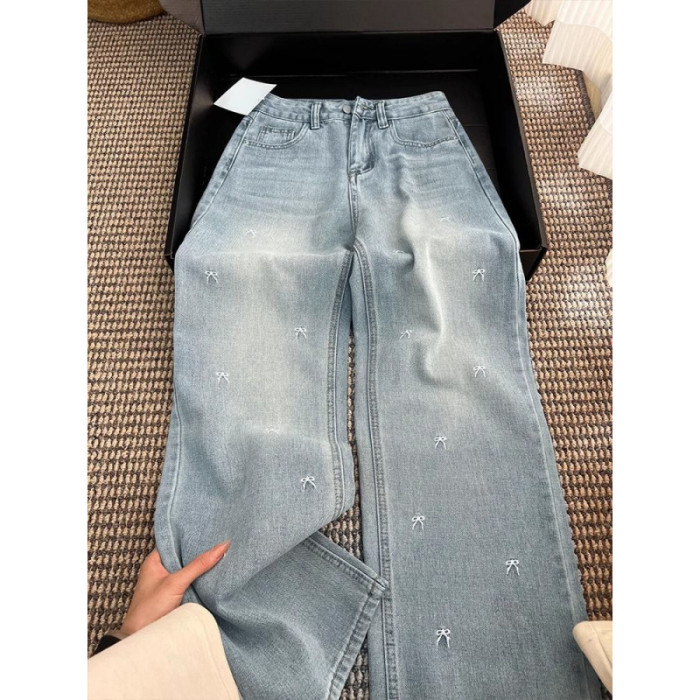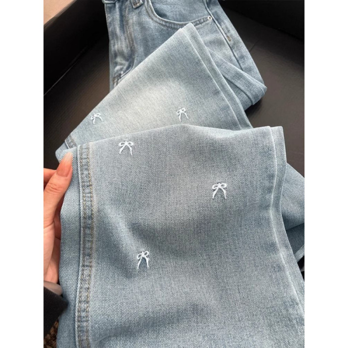 淺藍色蝴蝶結刺綉直筒牛仔褲女夏季薄款大碼胖mm高腰顯瘦濶腿褲子