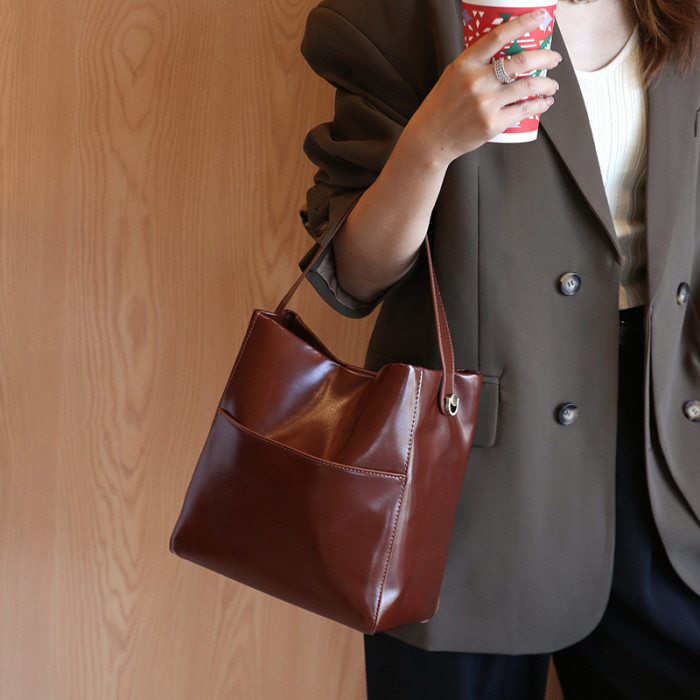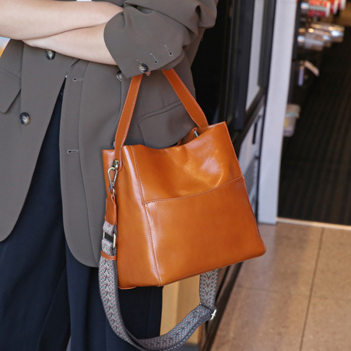 小衆設計水桶包女士頭層油蠟牛皮托特包 大容量通勤真皮單肩女包