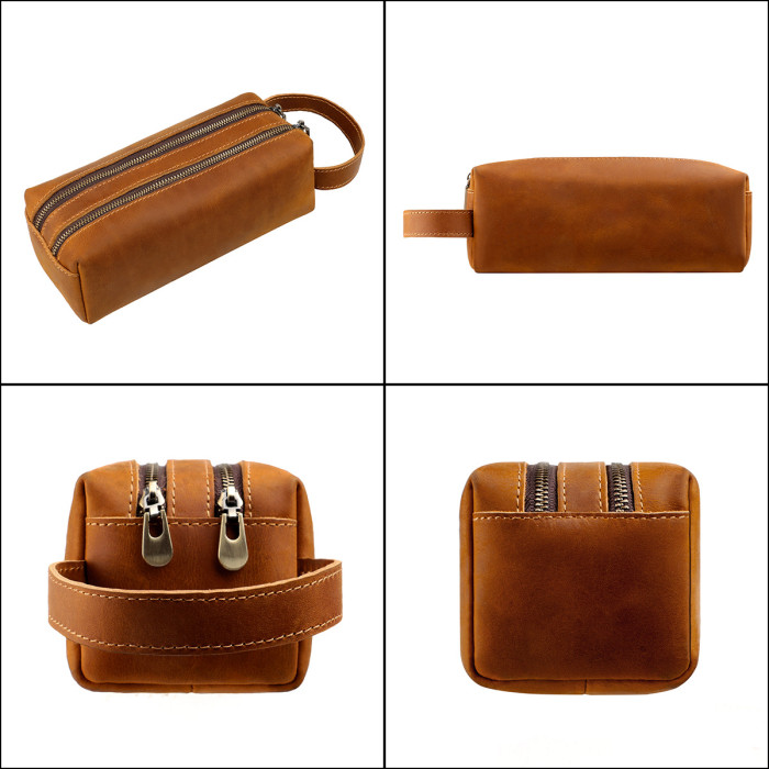 瘋馬皮雙拉鍊筆袋大容量手提文具手拿包鉛筆收納包真皮小包