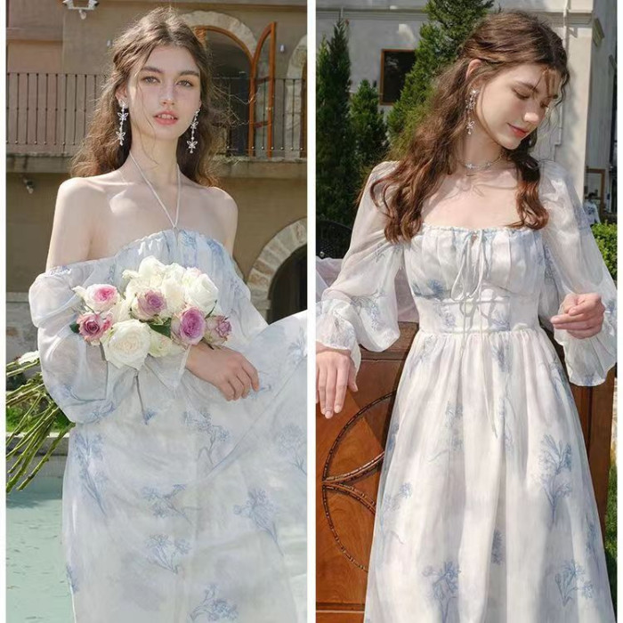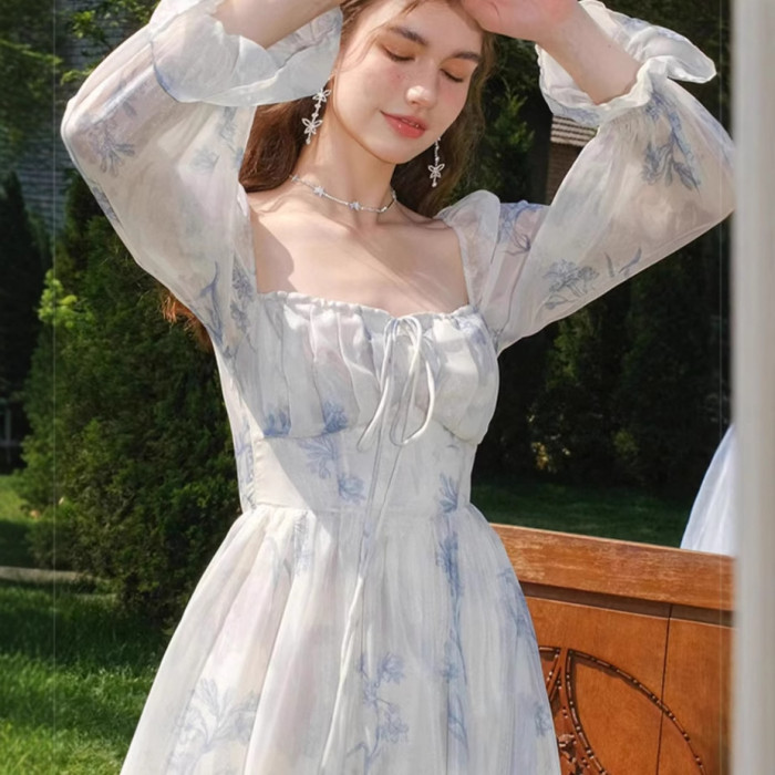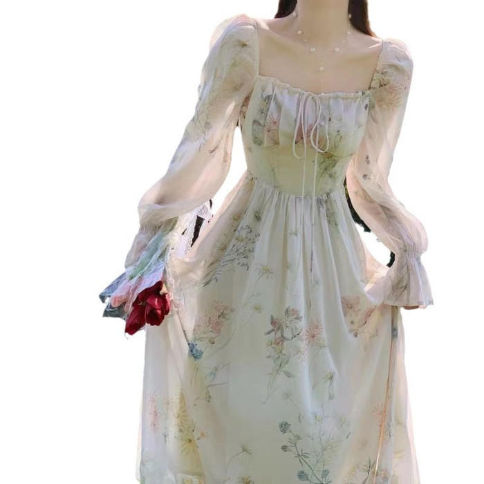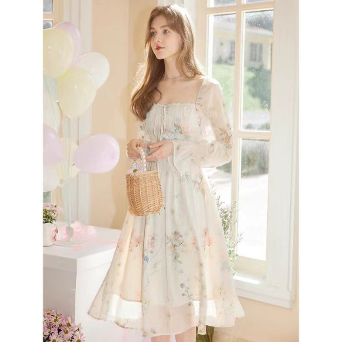 法式茶歇裙2024春夏新款燈籠袖氣質仙女長裙收腰碎花連衣裙女