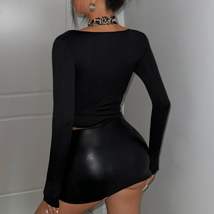 熱辣野性豹紋性感掛脖設計感裹胸魚骨T恤長袖上衣女70299