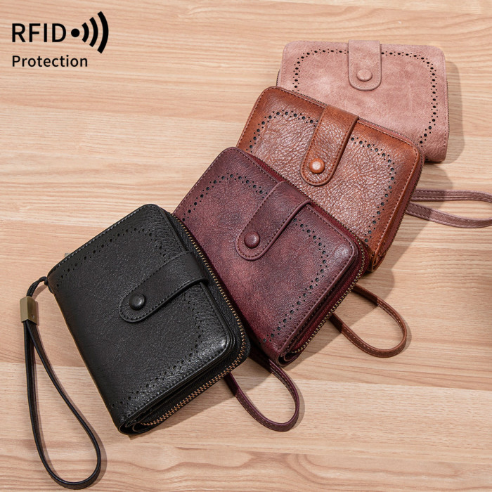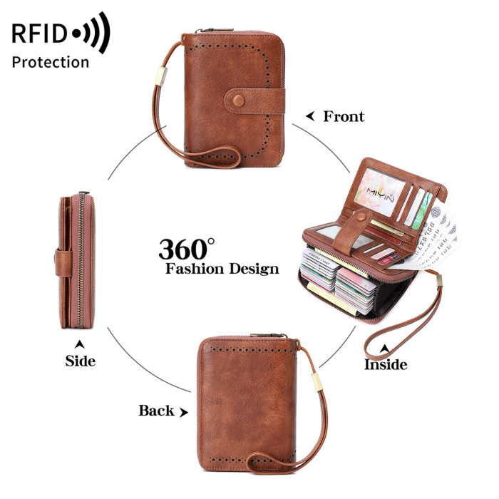 歐美復古油蠟皮風琴卡包新款RFID多功能大容量兩折女士短錢包
