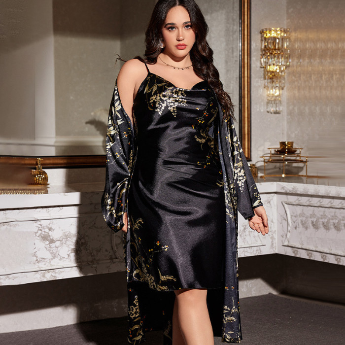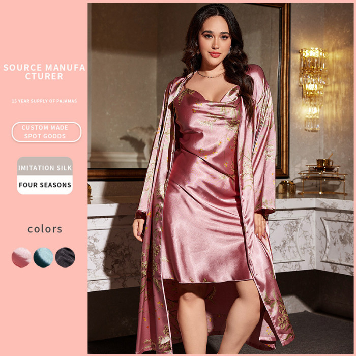 歐美風大碼女四季家居服系帶睡袍睡裙兩件套薄款外穿長款睡衣
