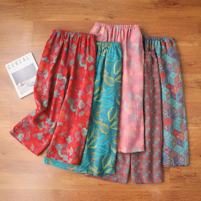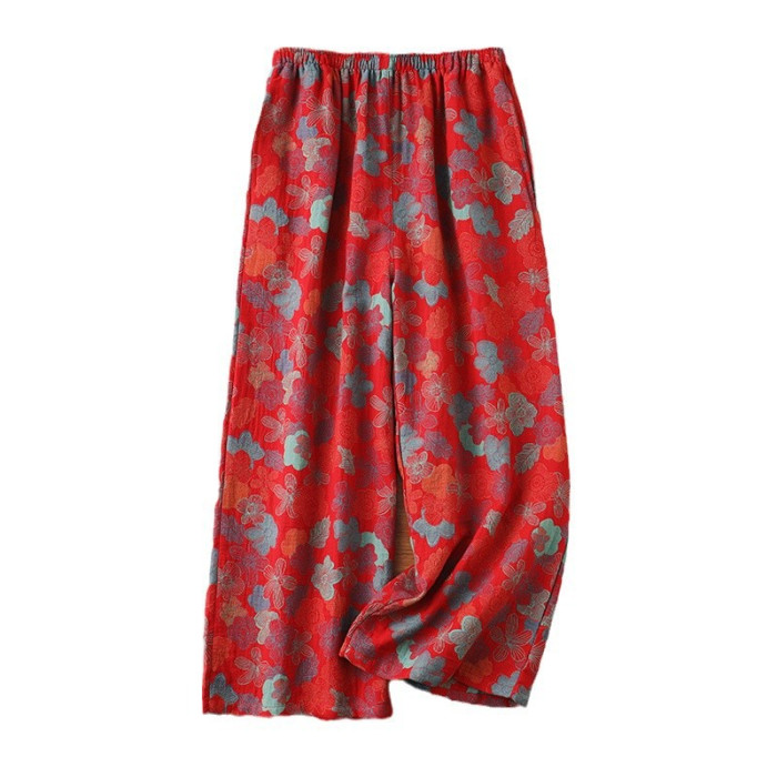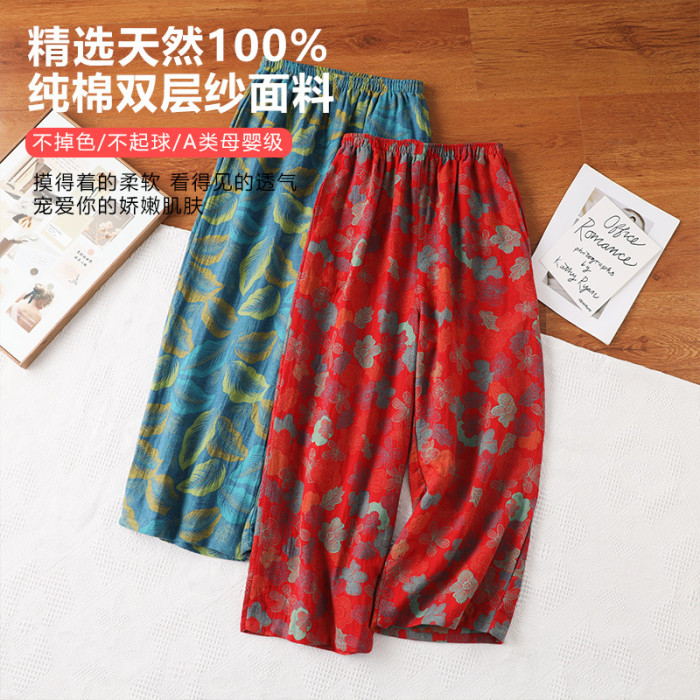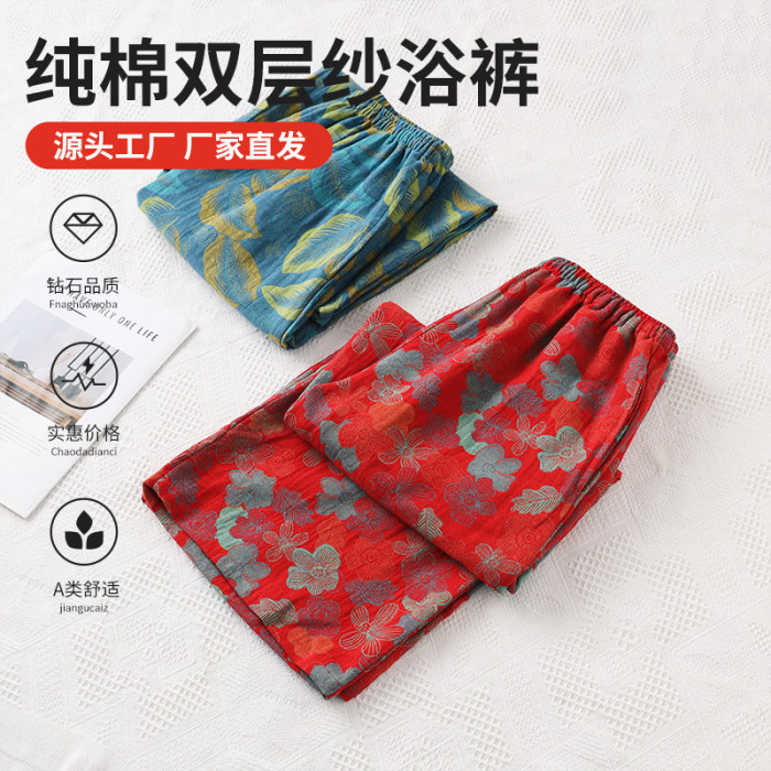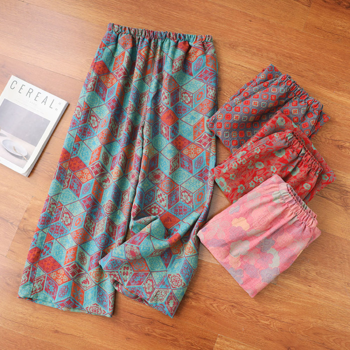 新款純棉雙層紗女士睡褲色織提花家居褲寬松柔軟濶腿休閒長褲