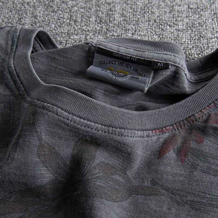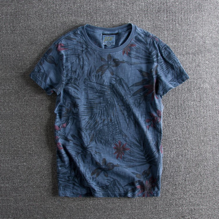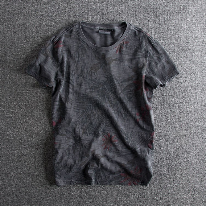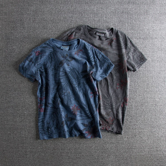 香港潮牌夏季樹葉印花休閒做舊復古潮流百搭海灘風圓領短袖男T恤