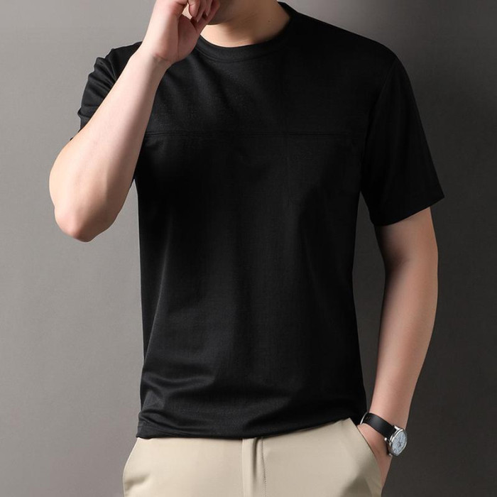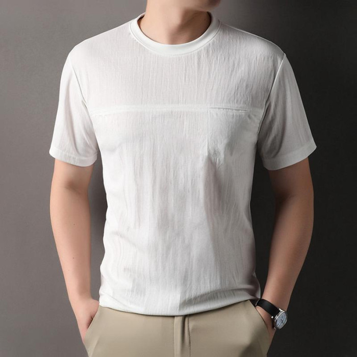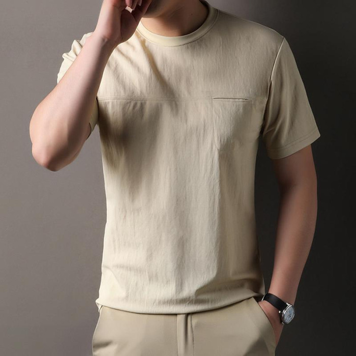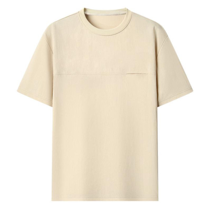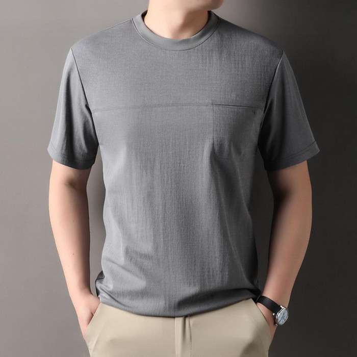 2025夏季新款棉麻短袖男T恤中年寬松圓領有口袋體恤打底半袖男