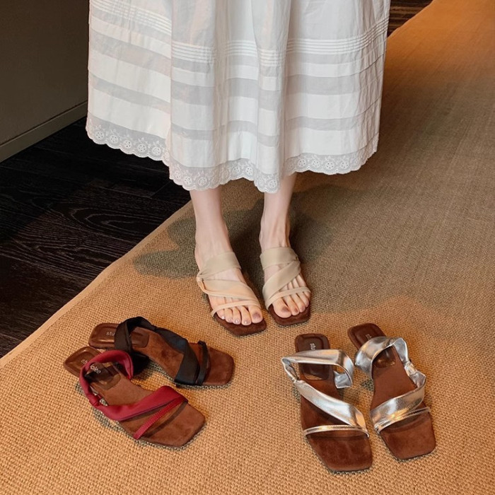 葡萄媽同款預售~跟高5.5cm~氣質方頭一字帶露趾粗跟坡跟涼拖鞋女