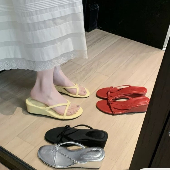 葡萄家~牛皮版跟高6cm~法式夾趾仙女風外穿細帶坡跟涼拖鞋女夏季