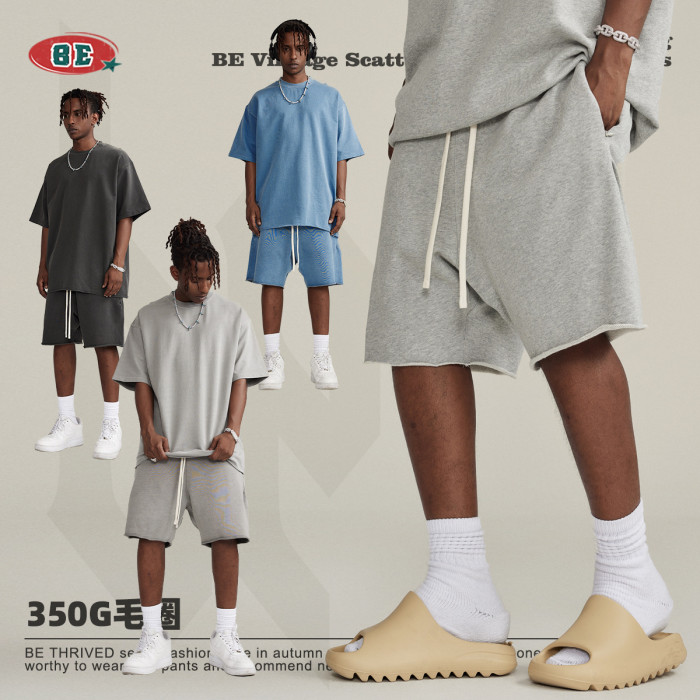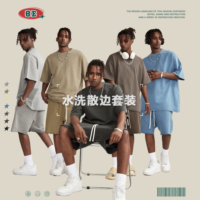 BE男裝2025春夏重磅潮牌水洗短袖套裝系列寬松散邊做舊痞帥男t恤