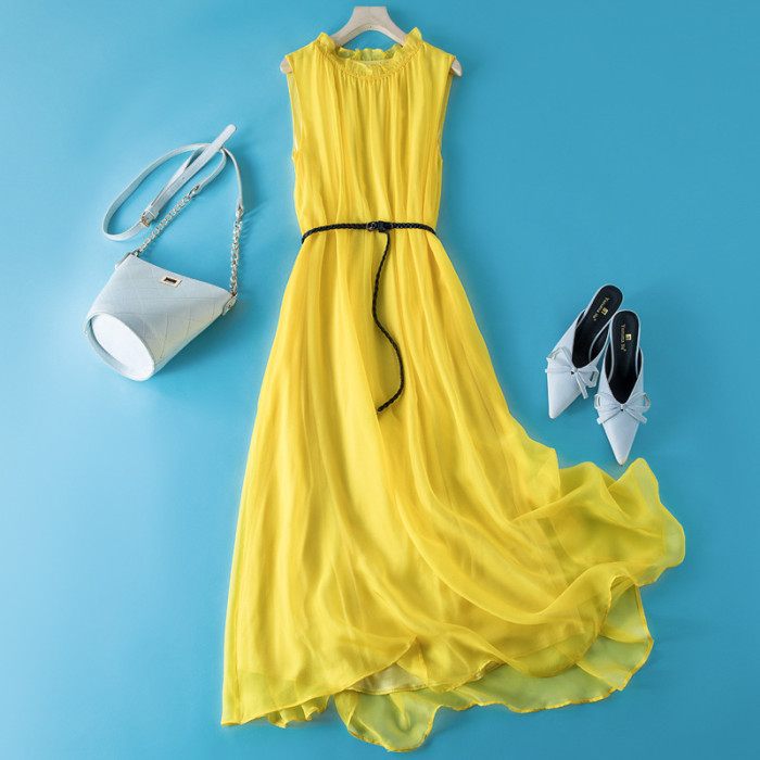無袖氣質真絲連衣裙2022夏季精品女裝系帶腰大擺裙寬松中長裙