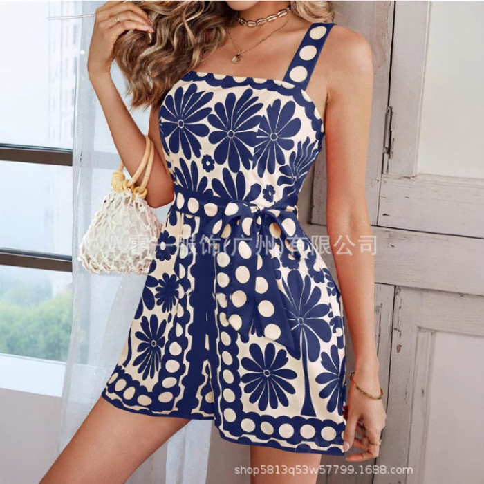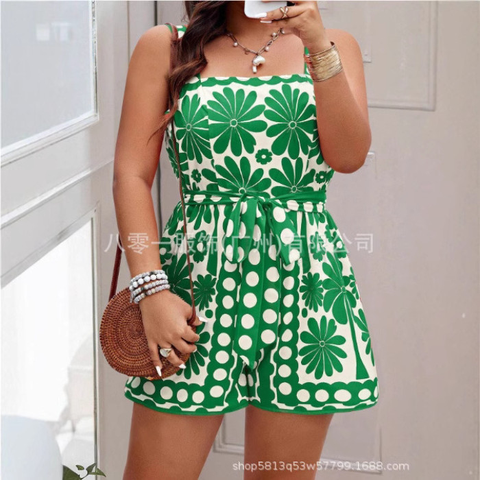 歐美復古休閒風 2025夏季新品印花無袖紐釦系帶短款濶腿連體褲女
