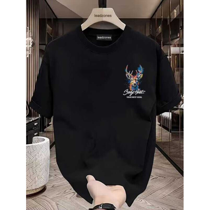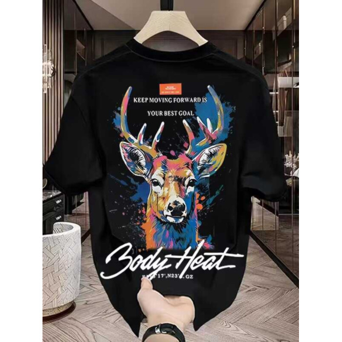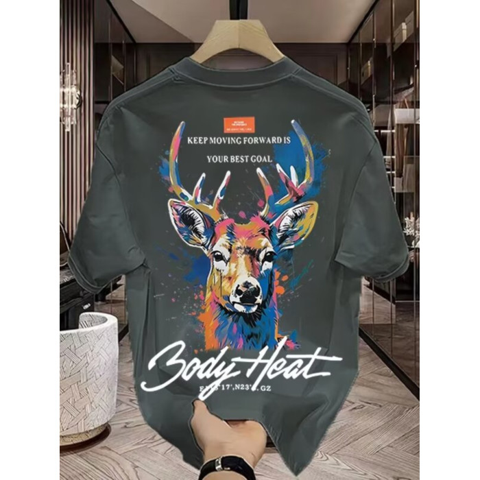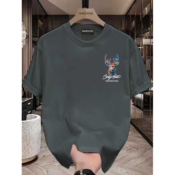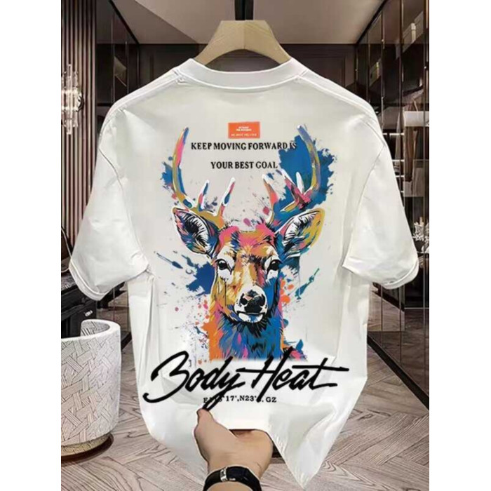 2024新款歐洲站痞帥潮流鹿頭圖案鹿頭印花高級冰絲光棉短袖男T恤