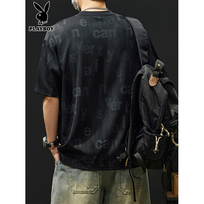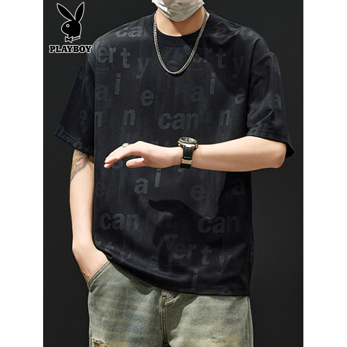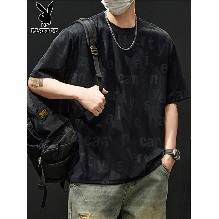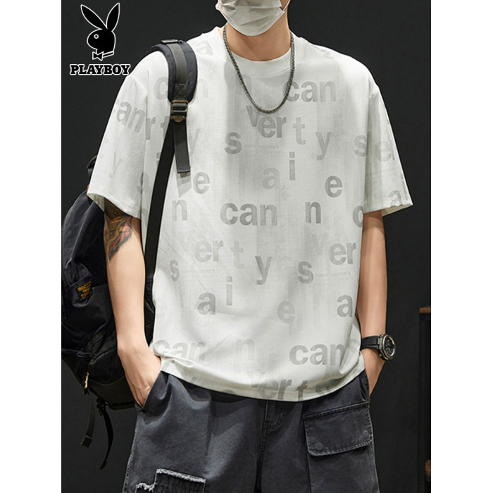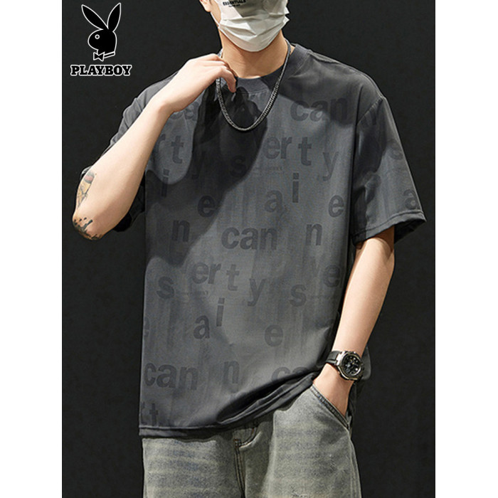 花花公子冰絲短袖男t恤2025新款夏季薄款寬松百搭圓領男士上衣
