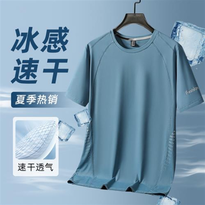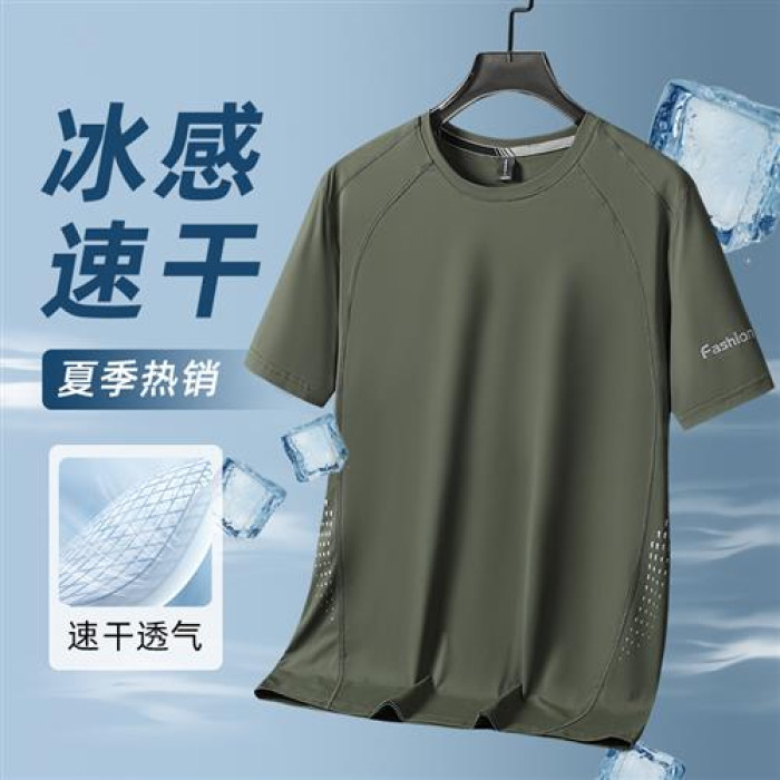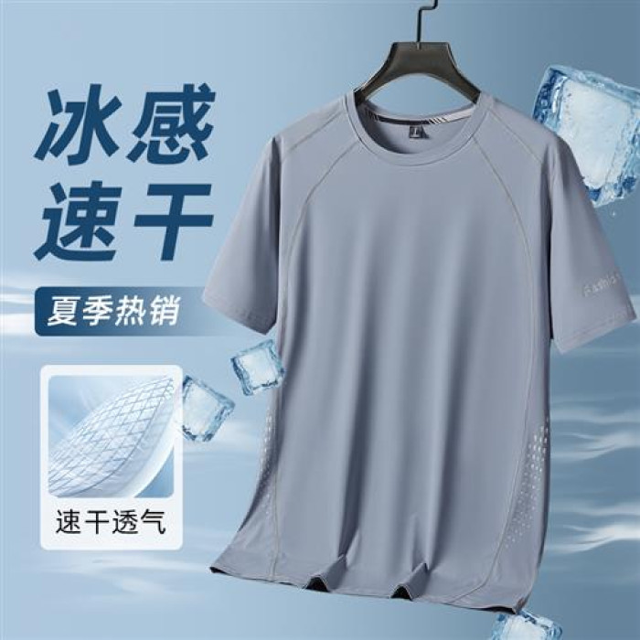 冰絲速乾男t恤夏季薄款休閒運動衫彈力大碼男裝寬松圓領半袖上衣