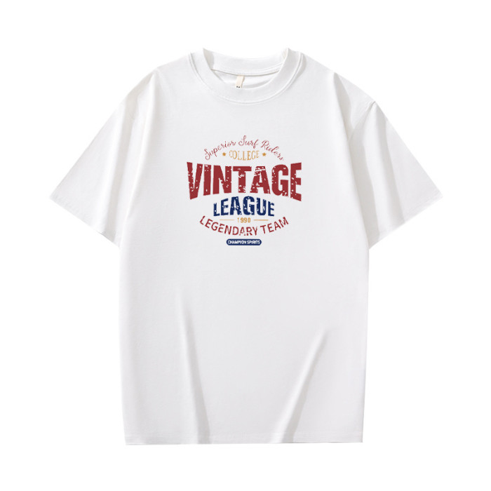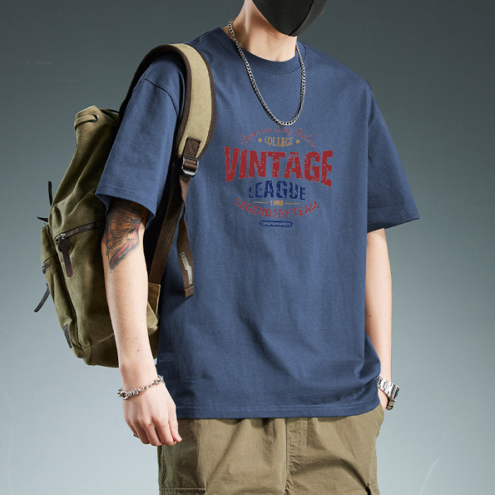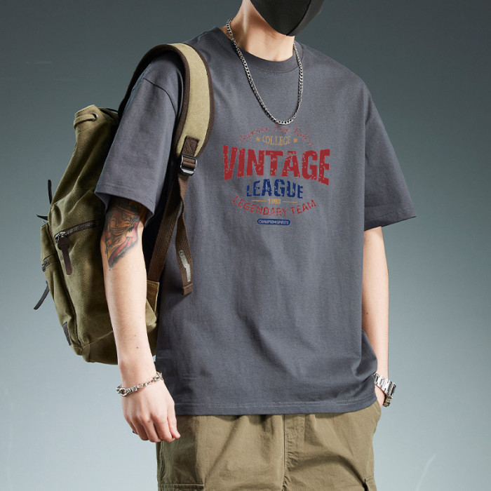高品質夏季男士潮流短袖寬松港風純棉男T恤青少年體恤五分袖帥氣