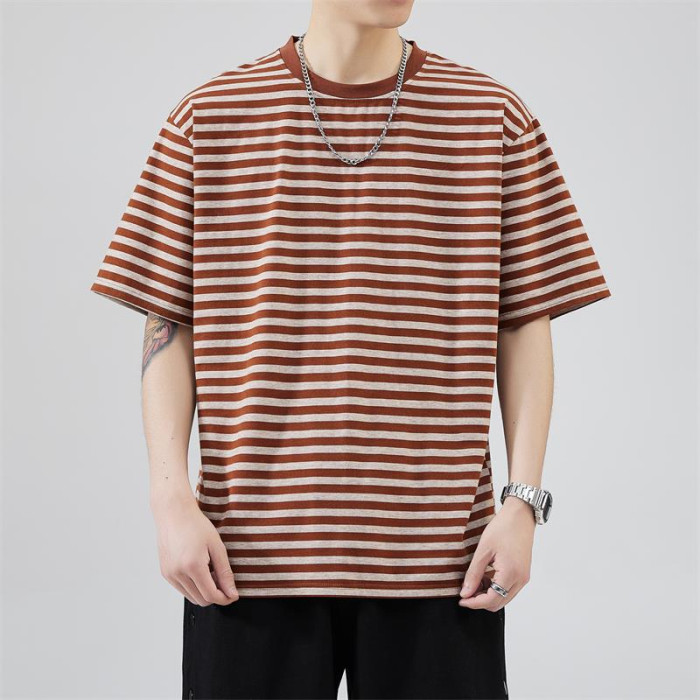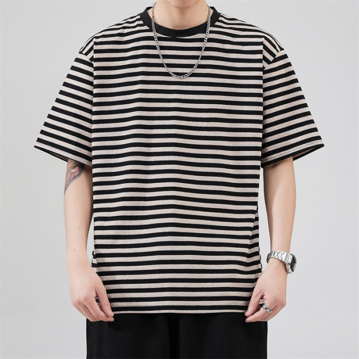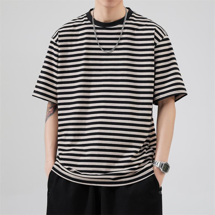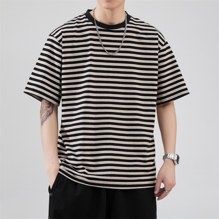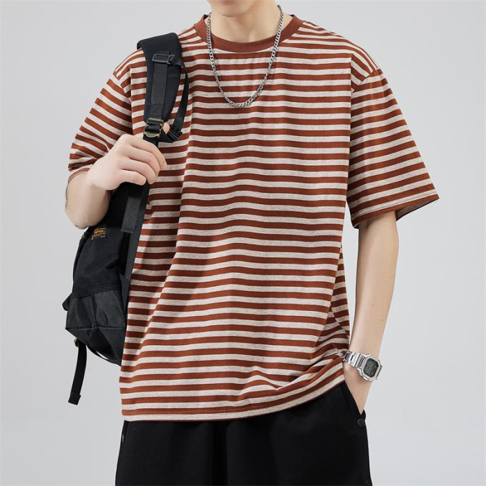 純棉條紋短袖男t恤日系簡約休閒上衣夏季寬松ins潮流帥氣半袖體恤