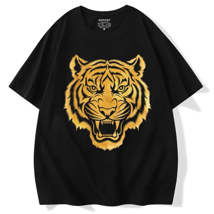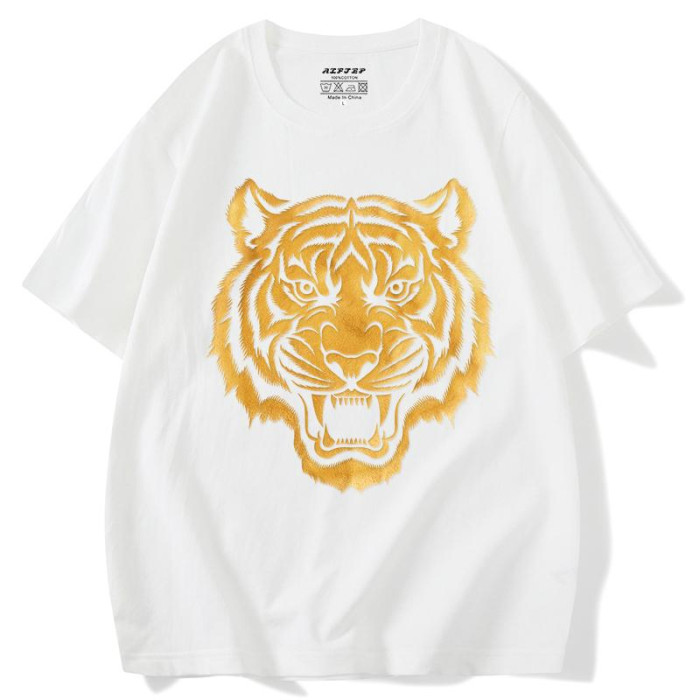 原創潮牌霸氣青年大碼金色老虎頭短袖高檔時尚圖案燙金潮男T恤棉