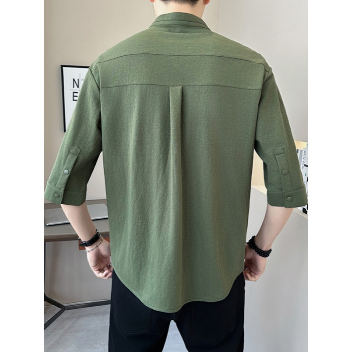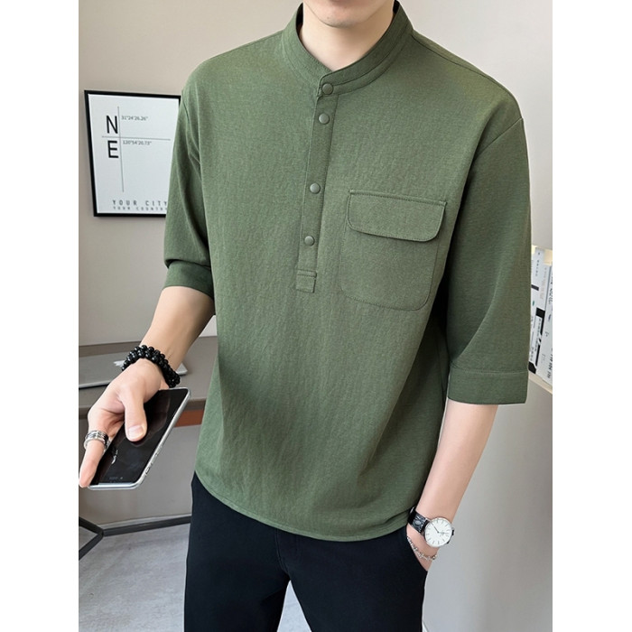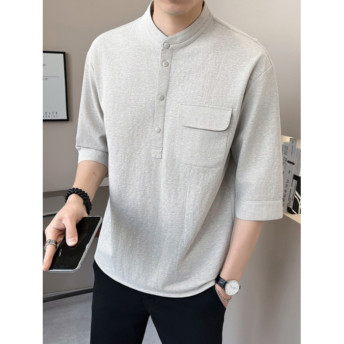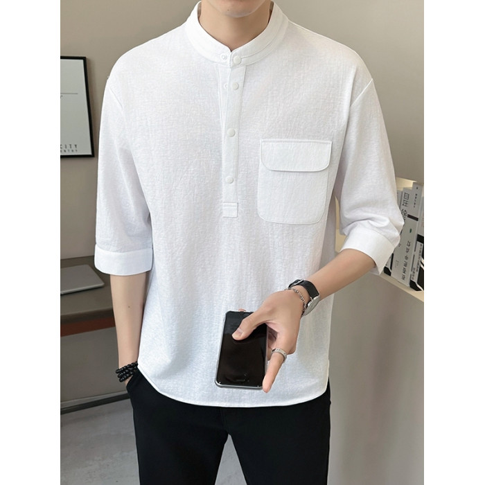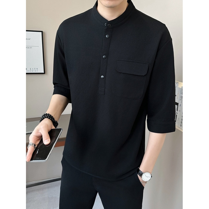 亞麻七分袖男t恤夏季新中式國風男裝棉麻立領短袖中式男士半截袖