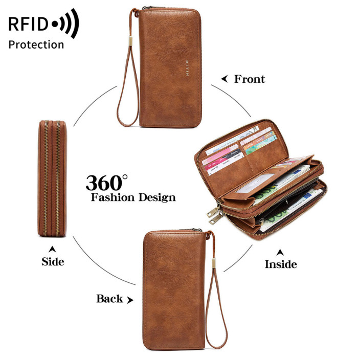 新款RFID防盜刷雙拉鍊錢包歐美復古女士手拿包簡約大容量錢夾