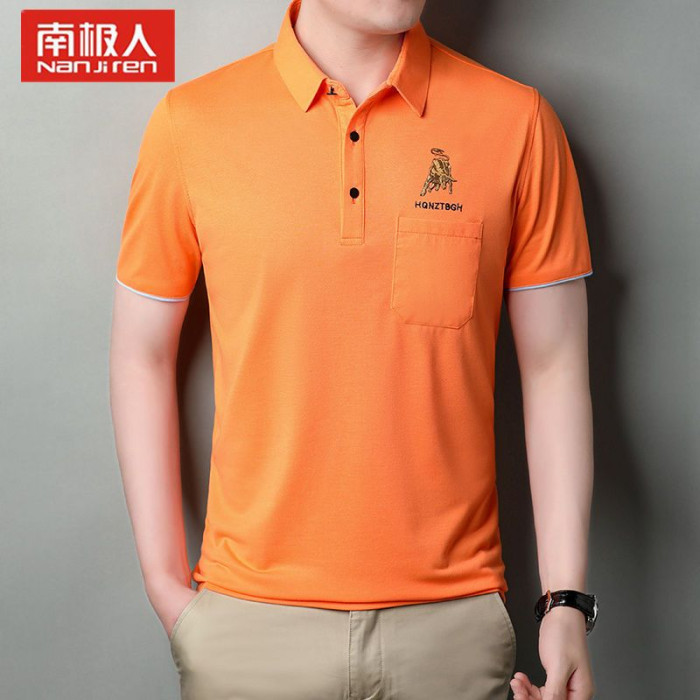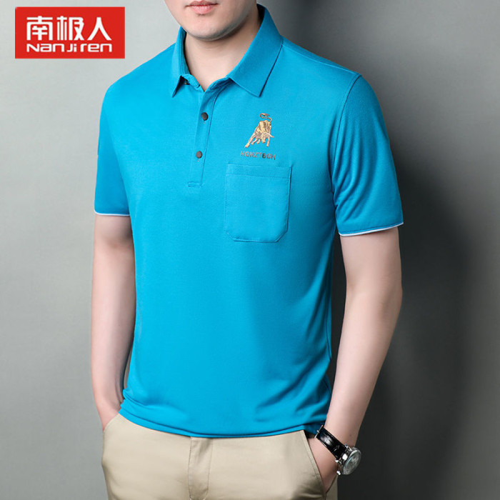 南極人品牌夏季短袖男t恤翻領 男士本命年紅色上衣服口袋大碼男裝