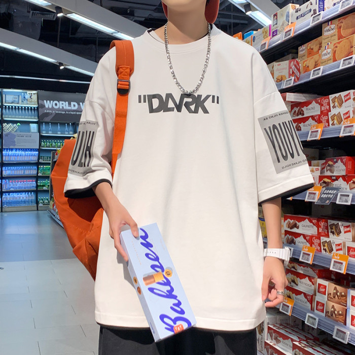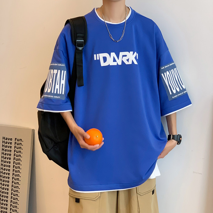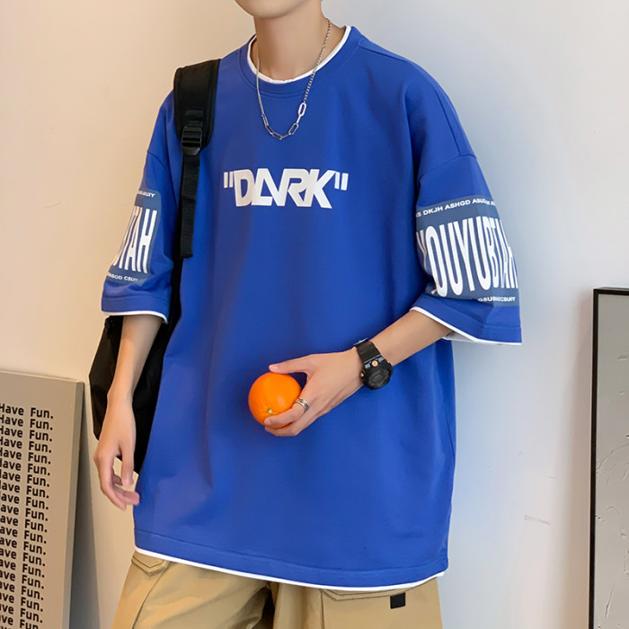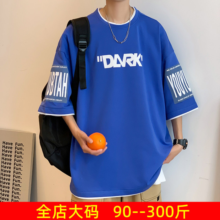 300斤假兩件短袖男t恤夏季2025新款ins印花百搭學生港風寬松半袖
