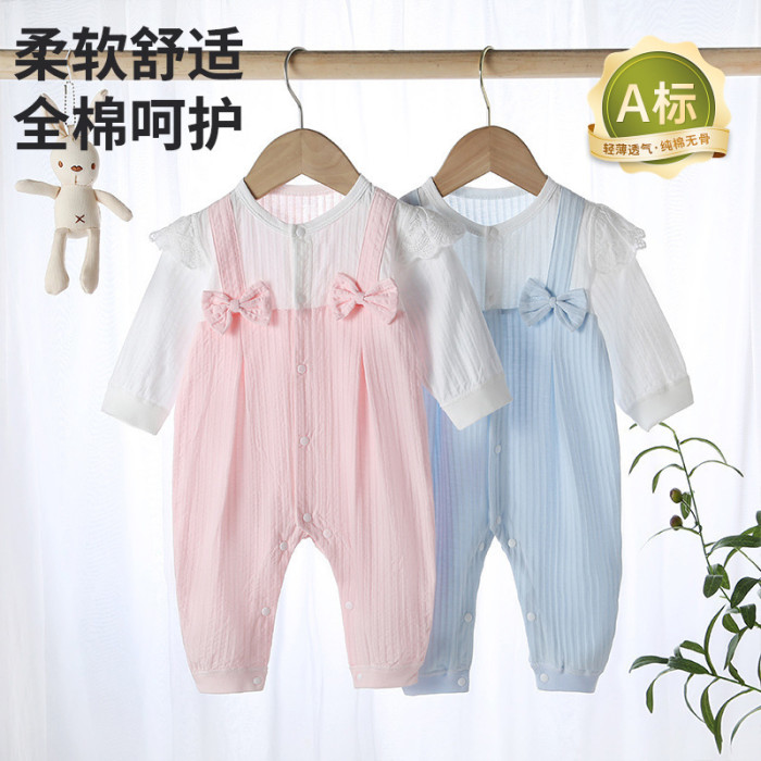 甜美雙蝴蝶結寶寶背帶式爬爬衣 長爬棉質長袖秋季新生兒連體衣