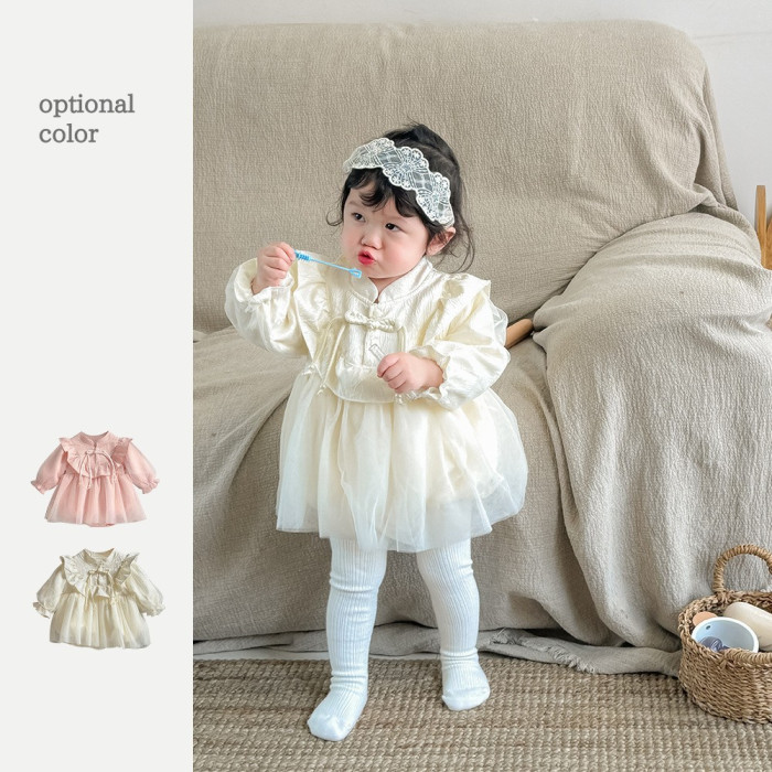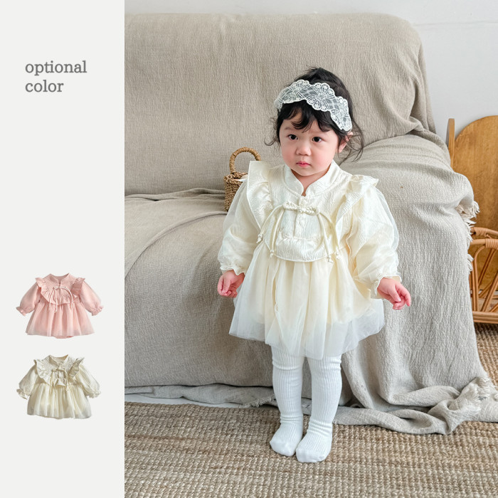 嬰兒衣服春裝宮廷風哈衣女寶寶甜美可愛網紗盤釦長袖新生兒包屁衣