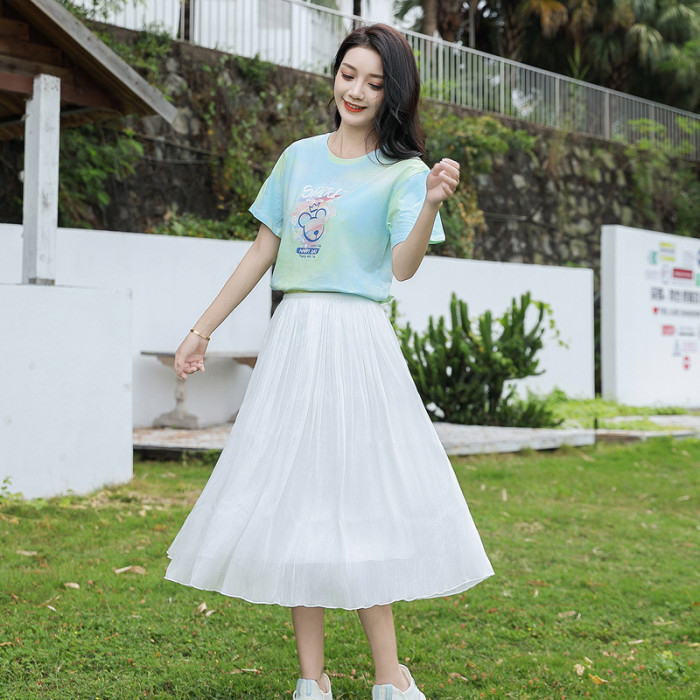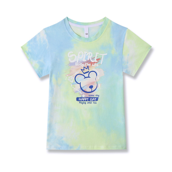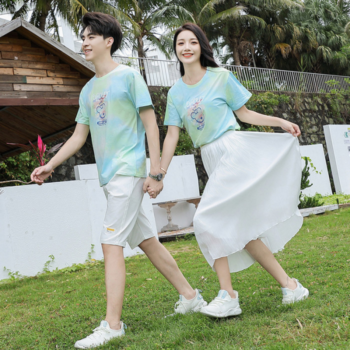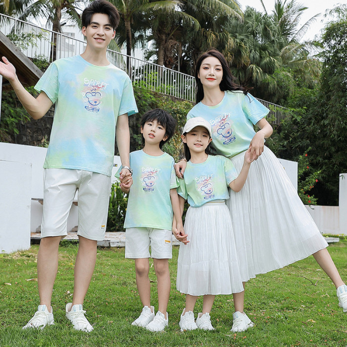 親子裝夏休閒裝新款紥染T恤一家三四口母子母女白色半身裙套裝