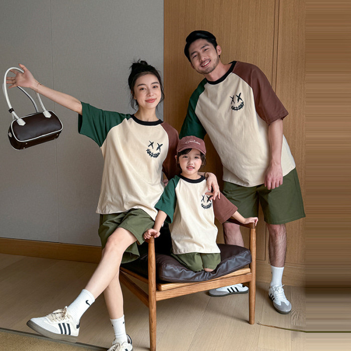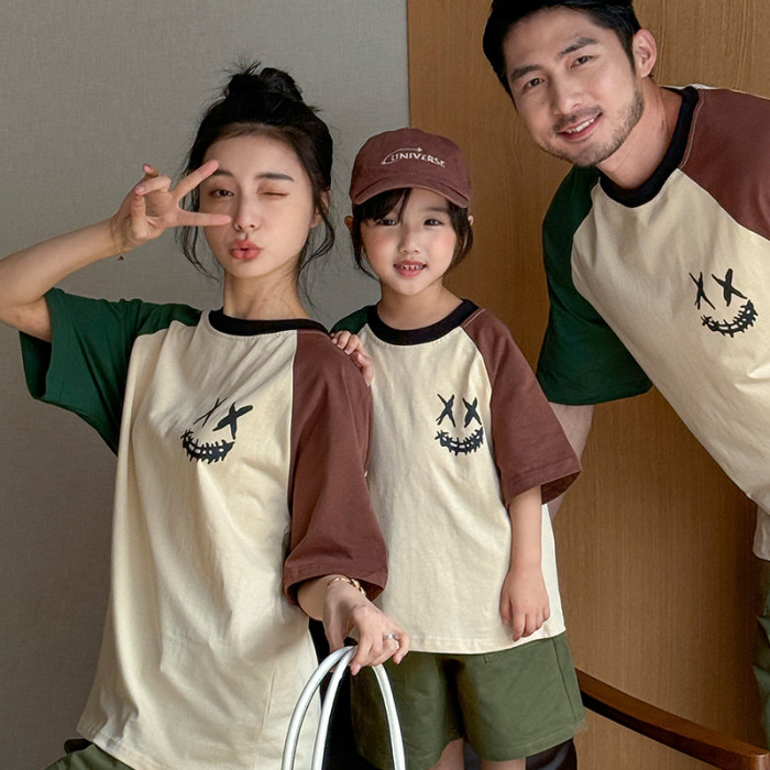 兒童撞色日系短袖T恤2025夏季親子裝洋氣插肩袖寬松百搭家庭裝潮T