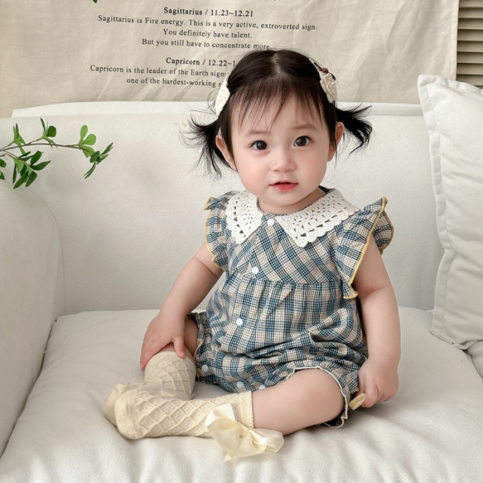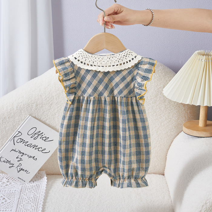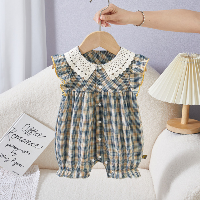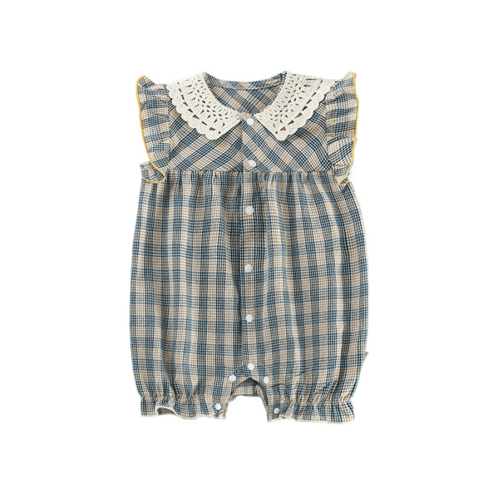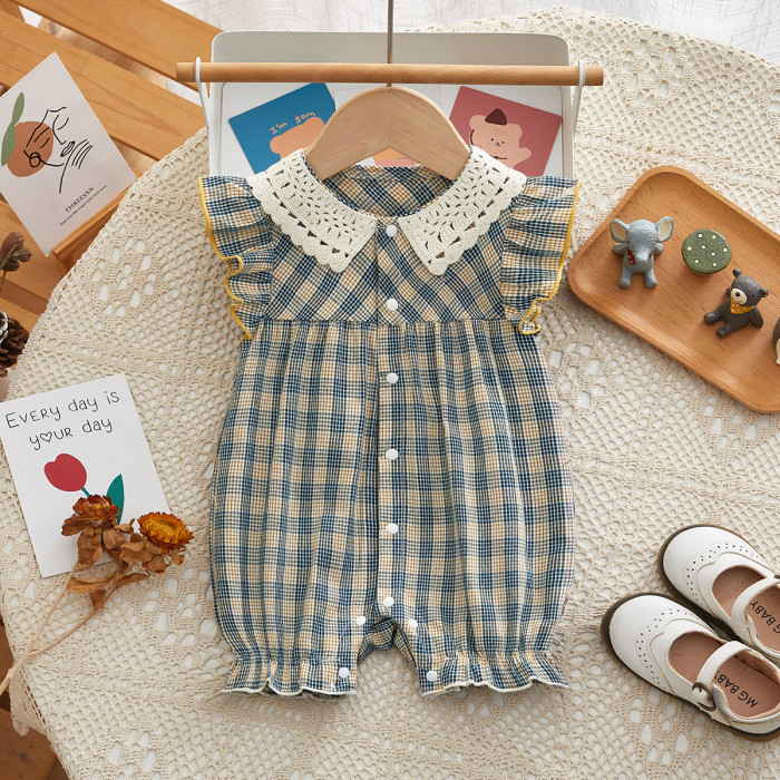 新生兒衣服嬰兒連體衣花邊格子前開嬰兒衣服短袖嬰兒夏裝