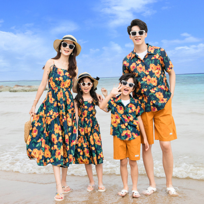 網紅炸街新款親子裝夏裝港風短袖碎花襯衫一家三口母女背帶褲套裝
