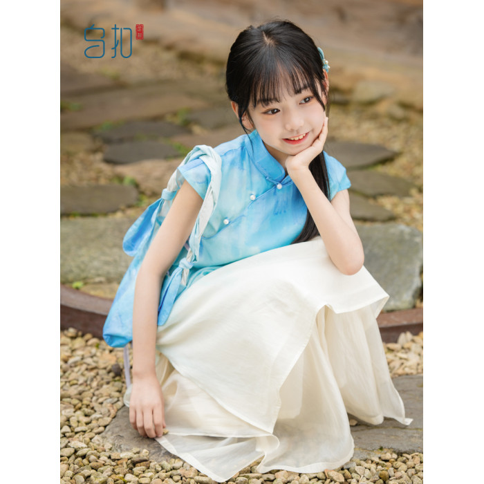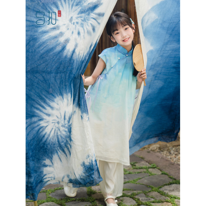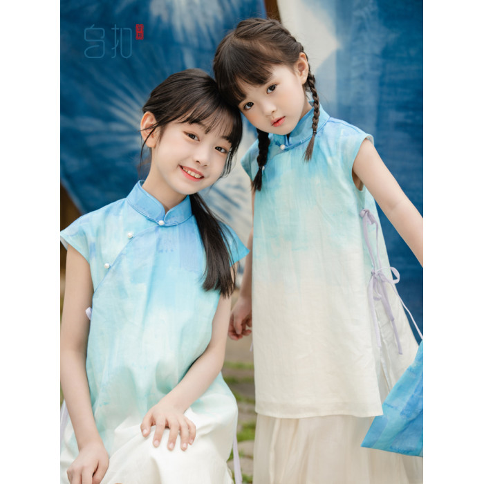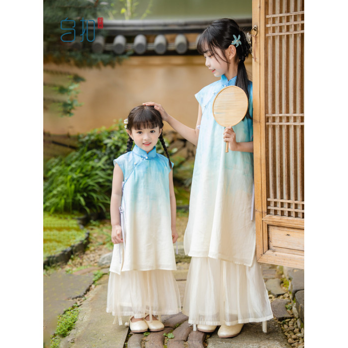 烏釦.徽因 女童旗袍夏款兒童民國風新中式古風套裝親子裝夏季薄款