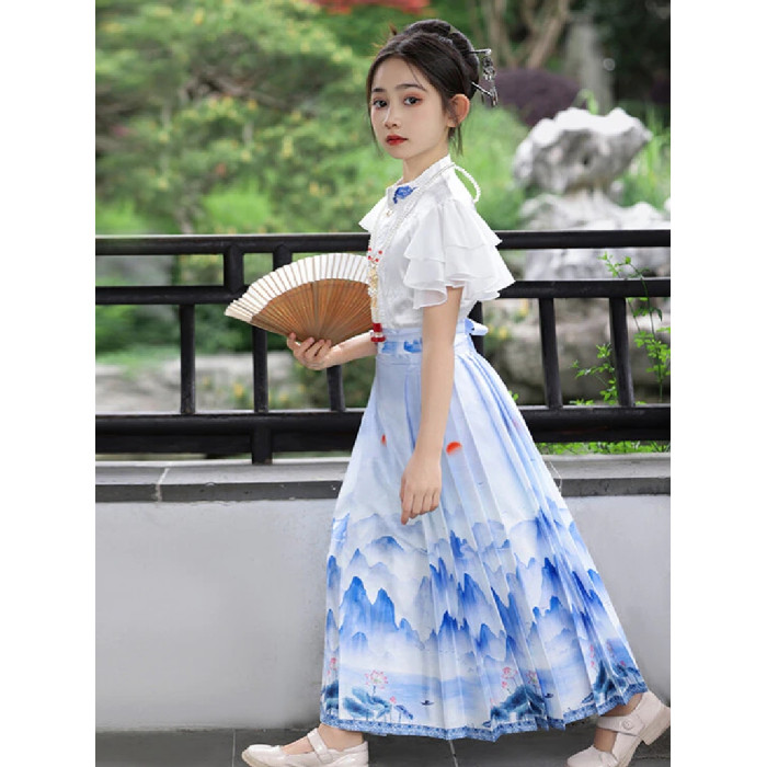 女童馬面裙套裝2025新款青花瓷連衣裙親子裝漢服風兒童表演服