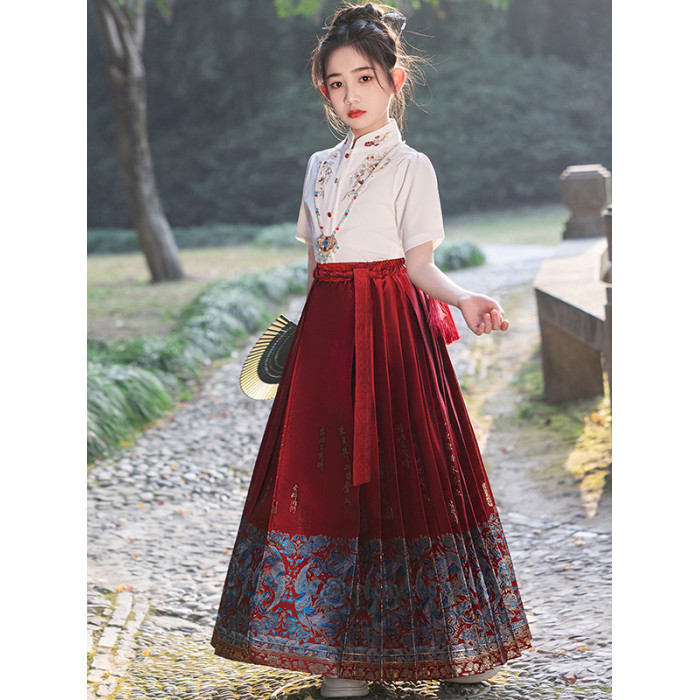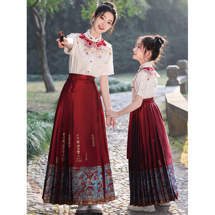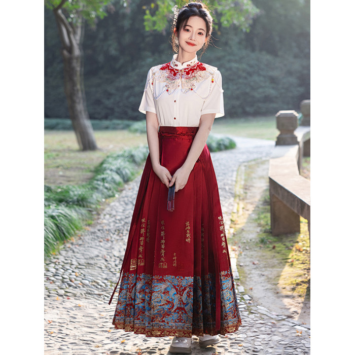 綉花襯衫短袖+鳳凰馬面裙紅色