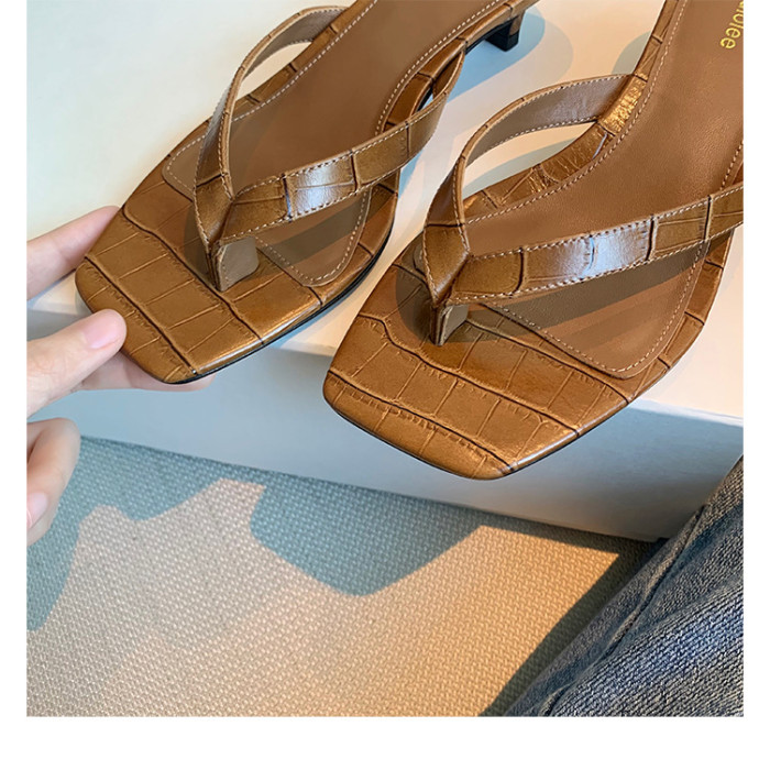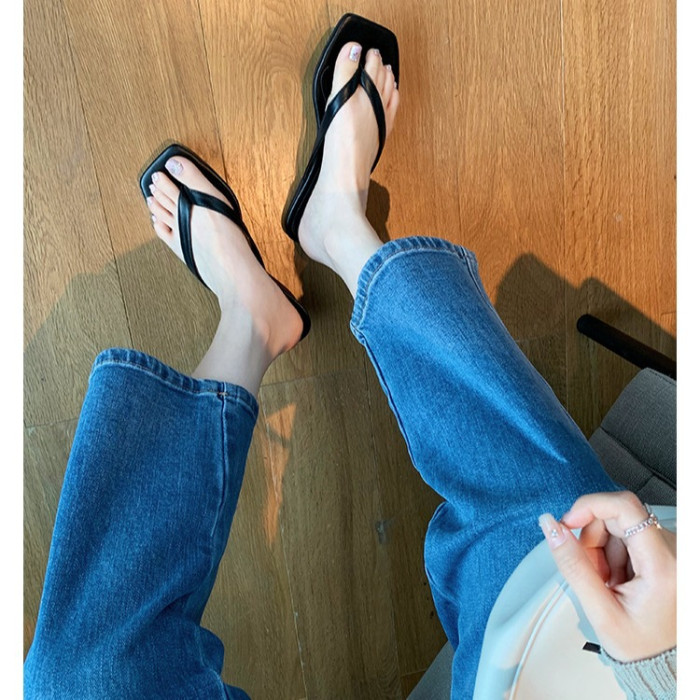 葡萄媽同款 曼城街角~夏季新款真皮平底人字拖外穿夾趾高跟拖鞋