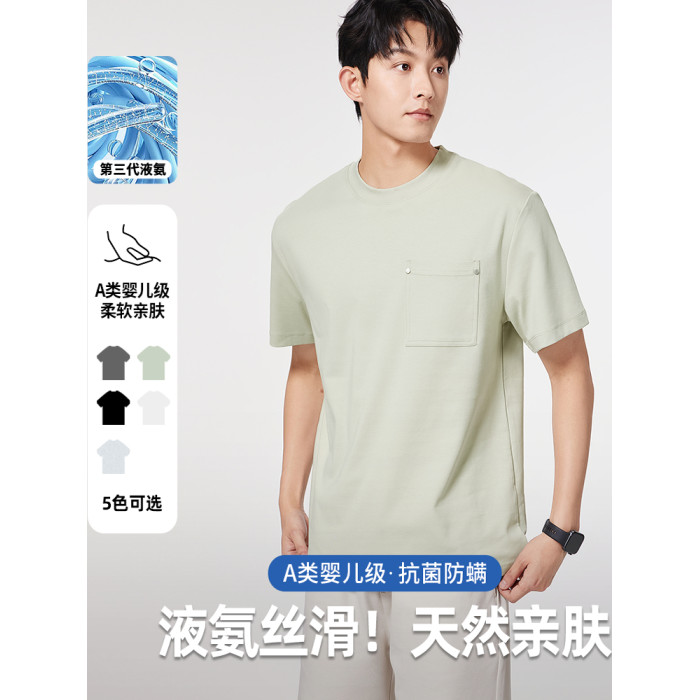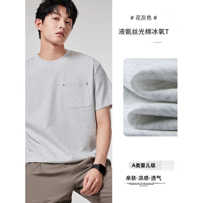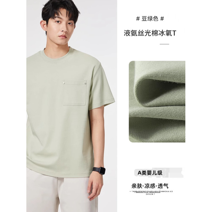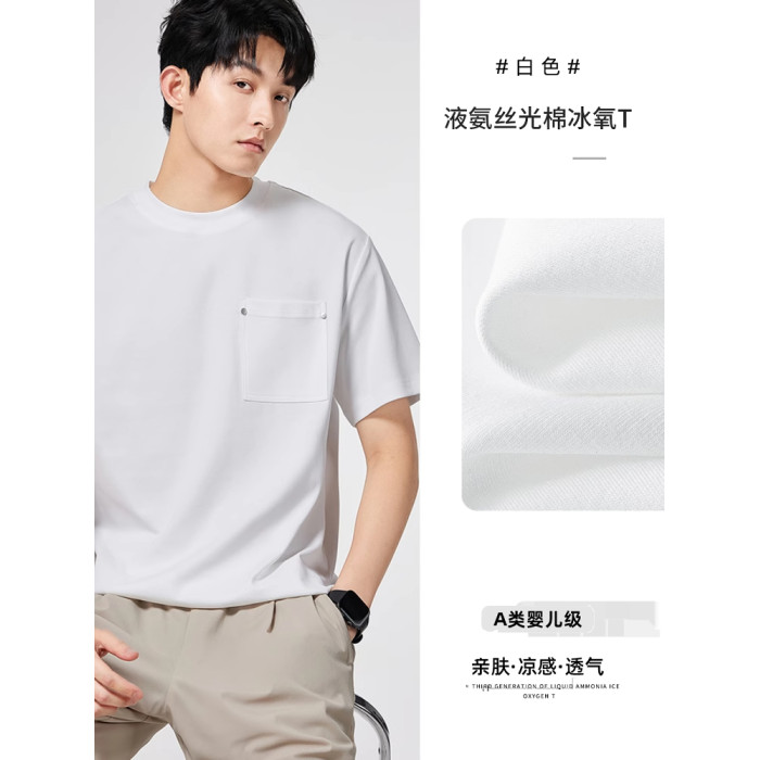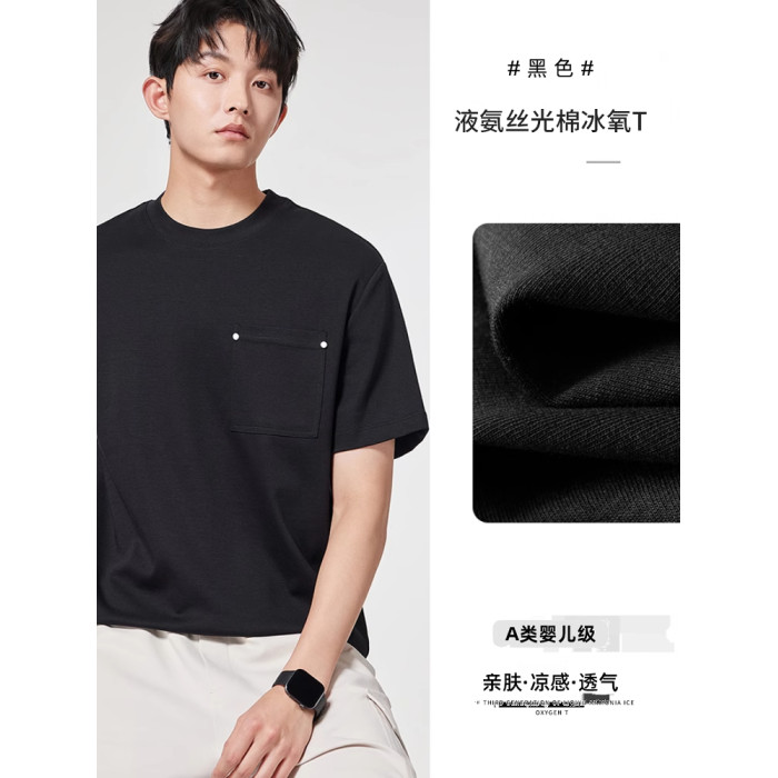 啄木鳥絲光棉短袖男T恤夏季冰絲涼感口袋半袖寬松圓領高級上衣