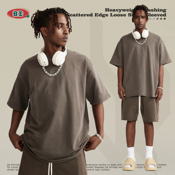 BE男裝2025春夏重磅潮牌休閒水洗短袖青年寬松散邊痞帥男t恤純棉