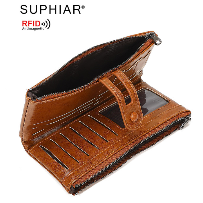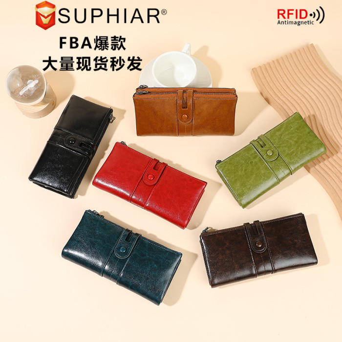 2025新品RFID防磁錢夾女士復古油蠟皮手拿包PU多功能長款錢包女
