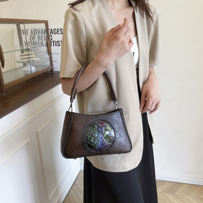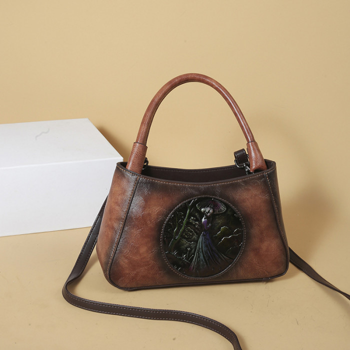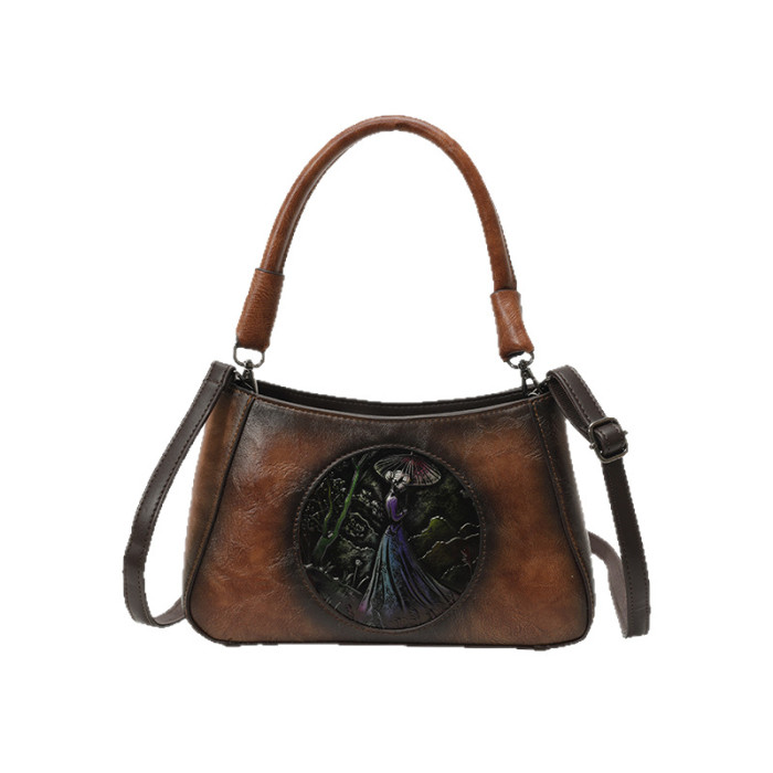 手提包復古風雕花單肩包民族風壓花質感中年女士包包