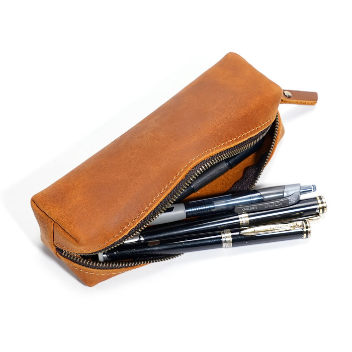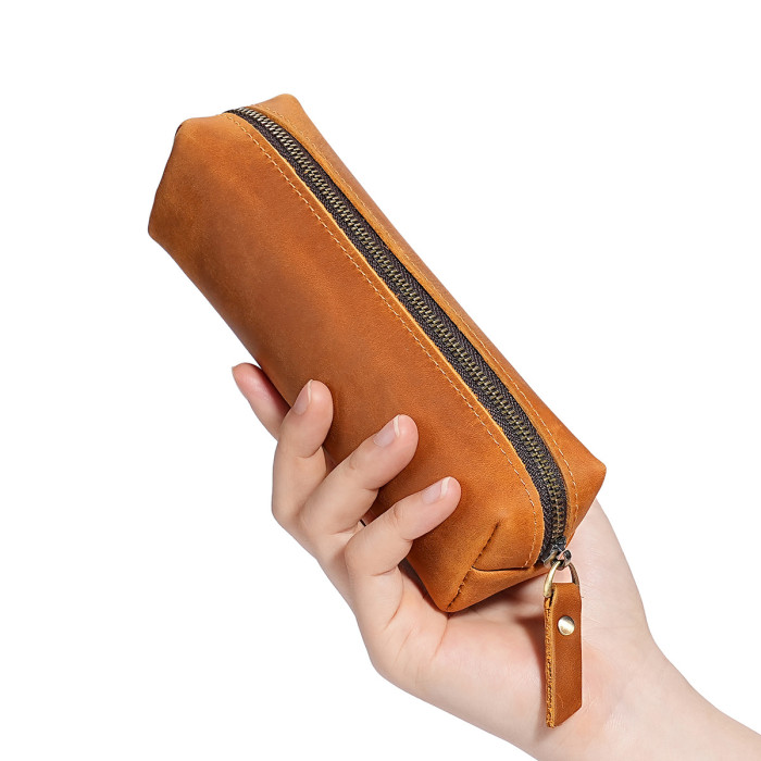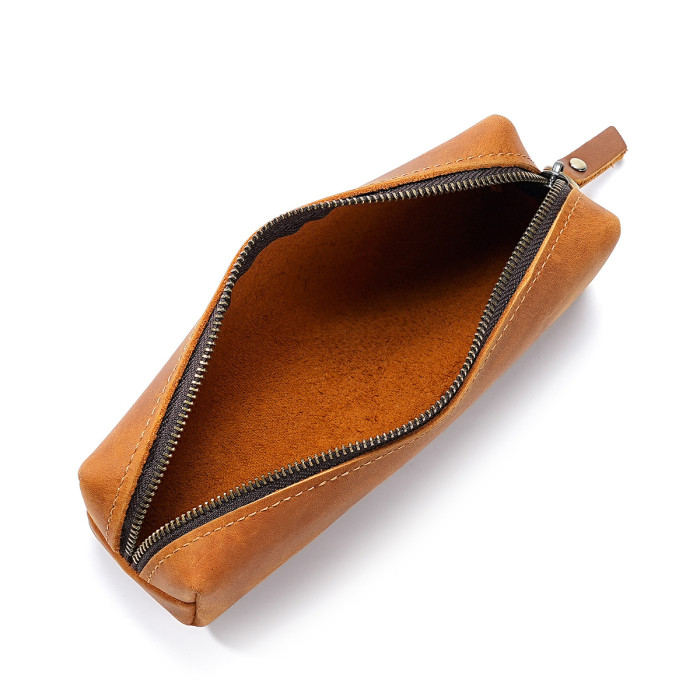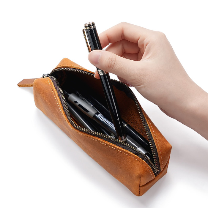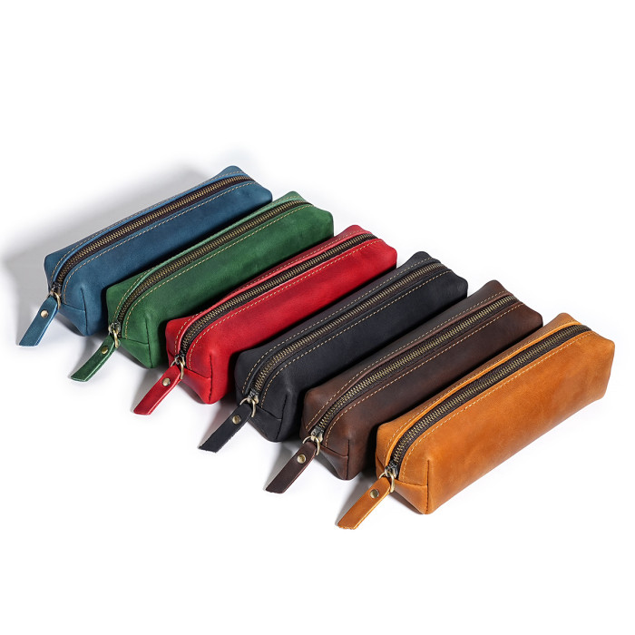 瘋馬皮新款文具筆袋頭層牛皮學生鉛筆鋼筆辦公用品拉鍊收納包真皮