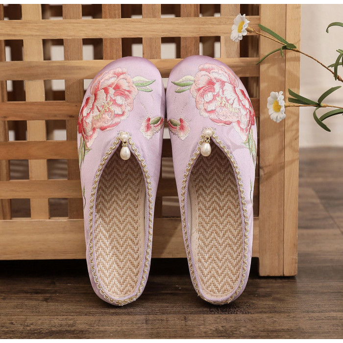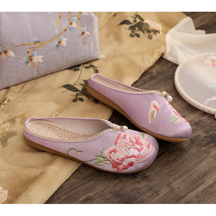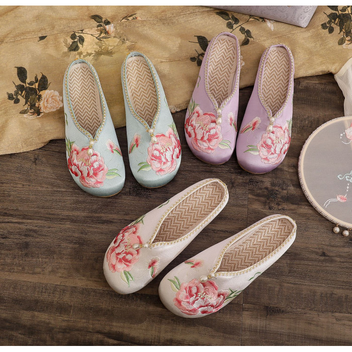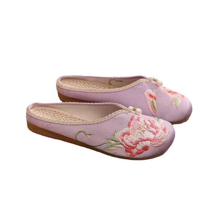 珠璣 2023夏季新款絲光面料復古圓頭拖鞋平底綉花鞋一腳蹬旗袍鞋