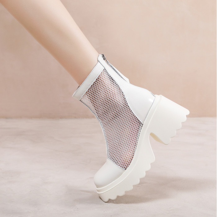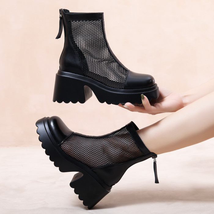 網紗涼靴女鞋2024新款夏粗跟高跟厚底松糕網鞋女透氣網面馬丁女靴
