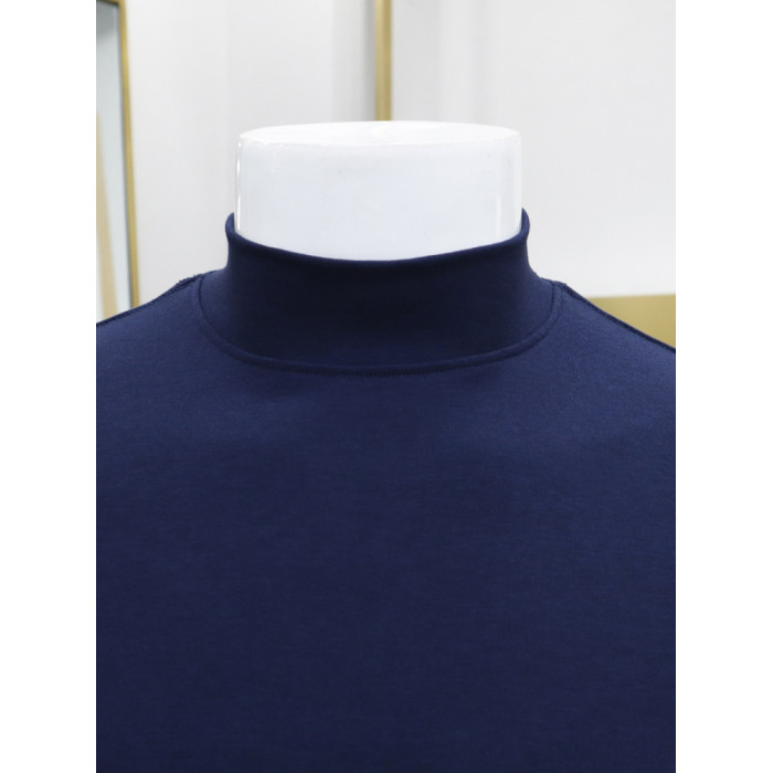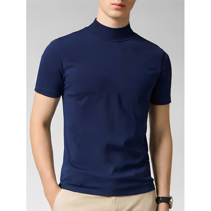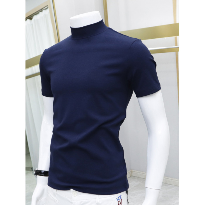 寶藍色半高領短袖男T恤2025新款夏季打底衫修身上衣服中領半袖潮