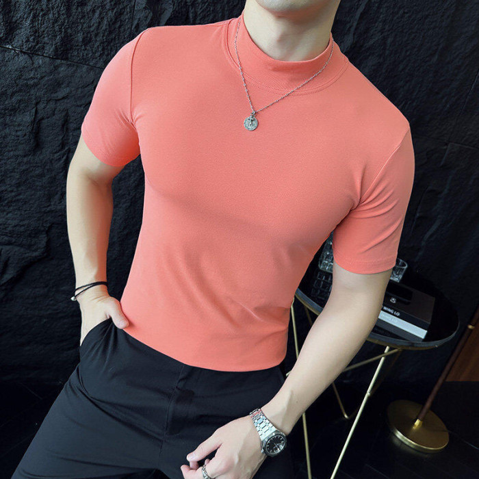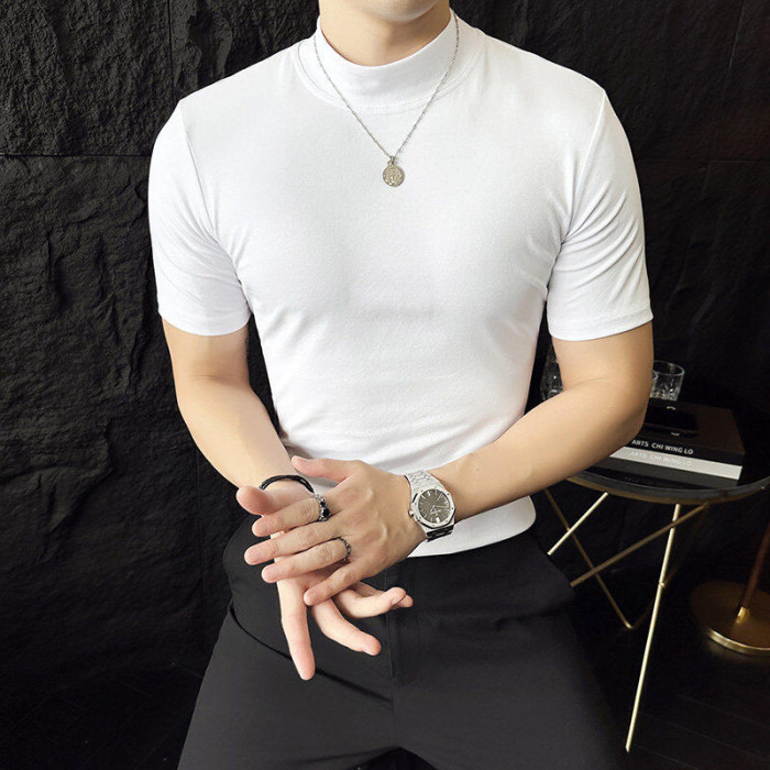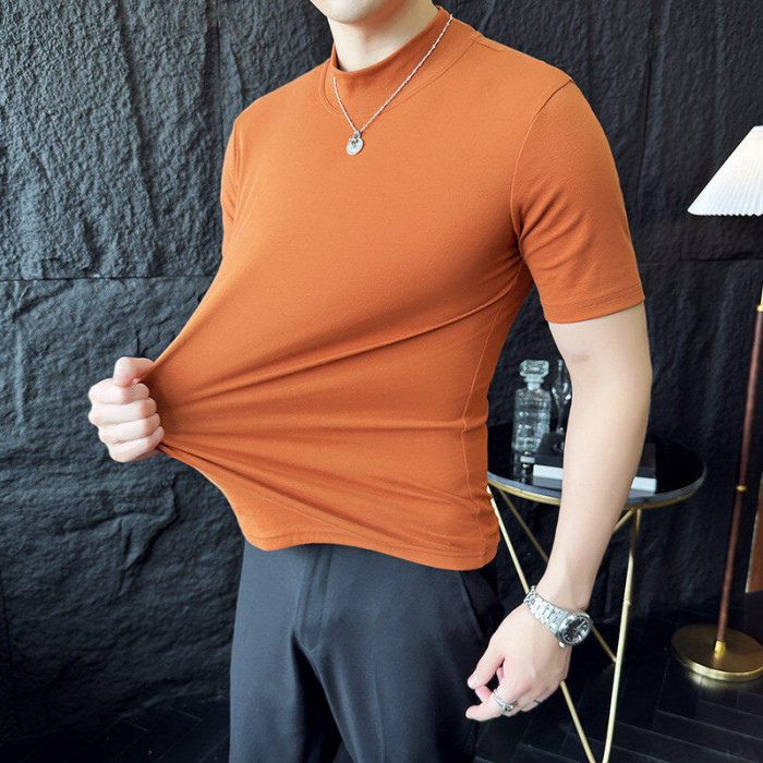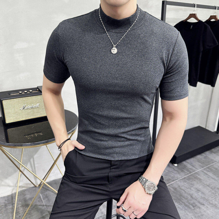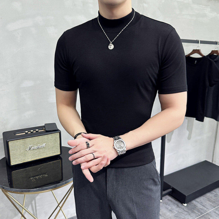 半高領短袖男T恤打底衫修身彈力夏季中領半袖高級感痞帥2025新款T