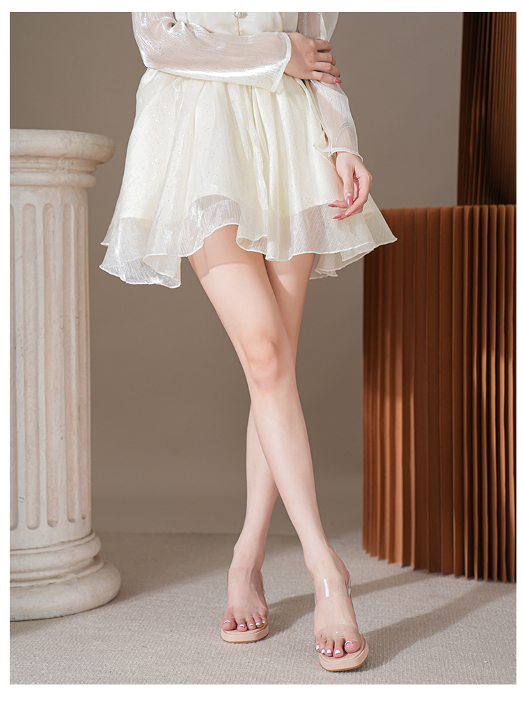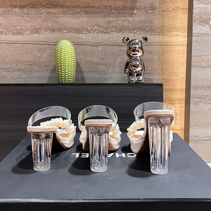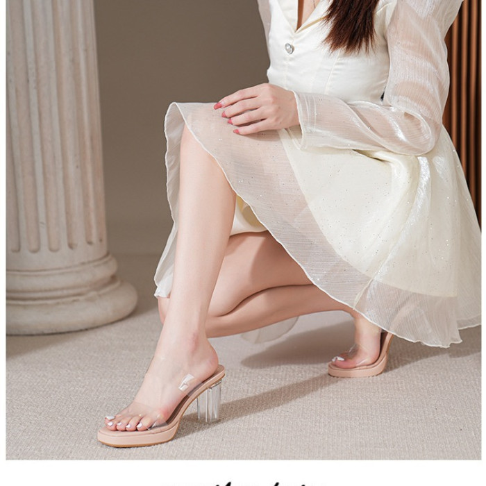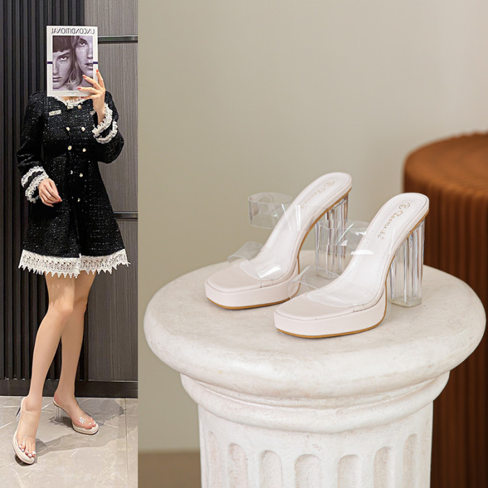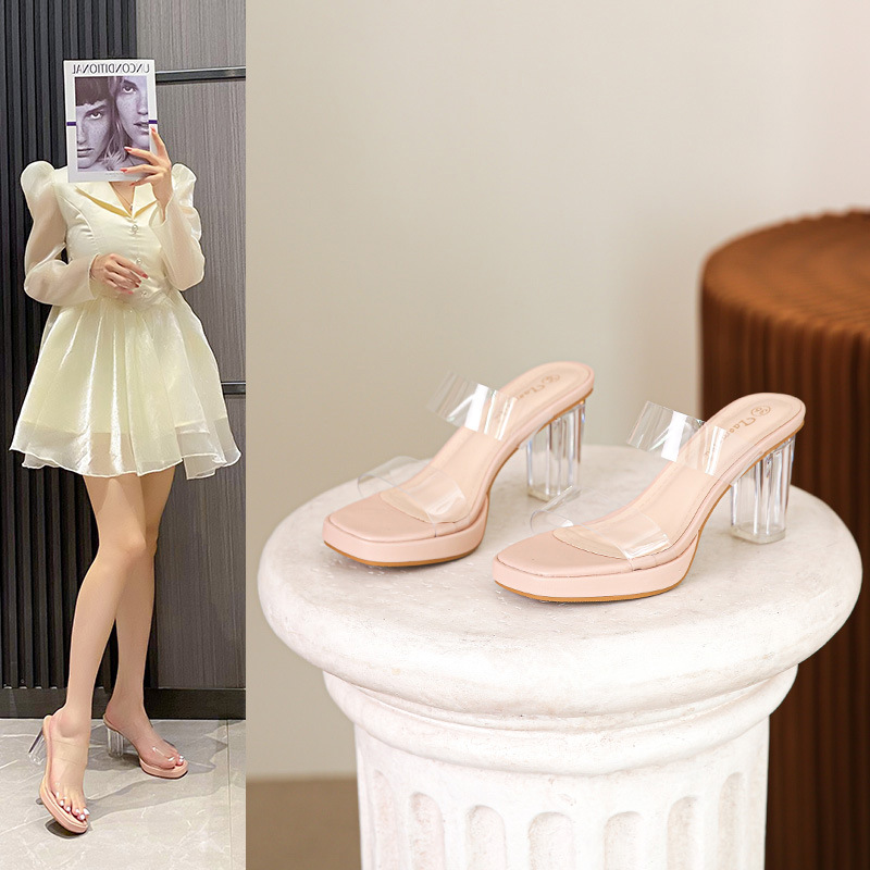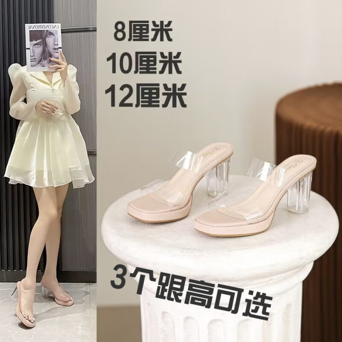2023年夏季新款一字帶高跟拖鞋防水台水晶粗跟中跟小碼透明涼鞋女