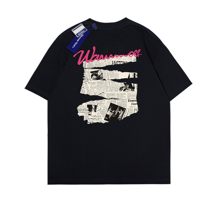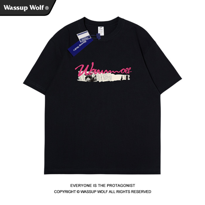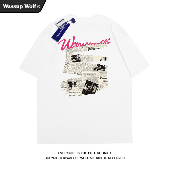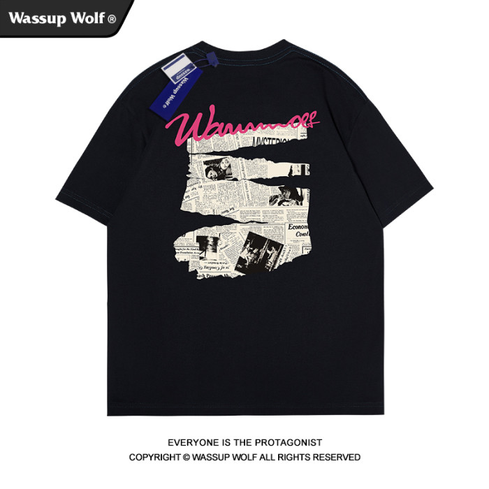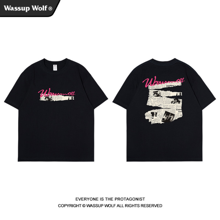 Wassup Wolf潮牌美式高街復古報紙短袖男t恤vintage純棉情侶上衣