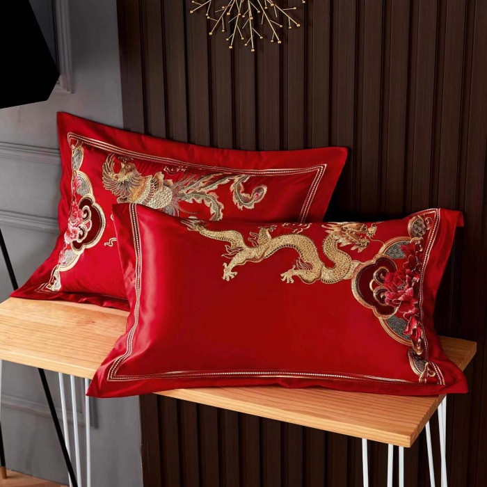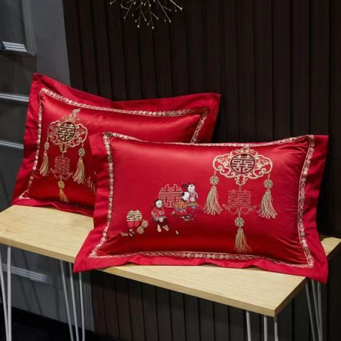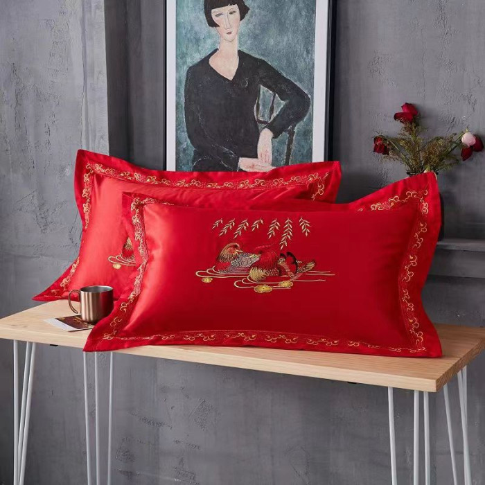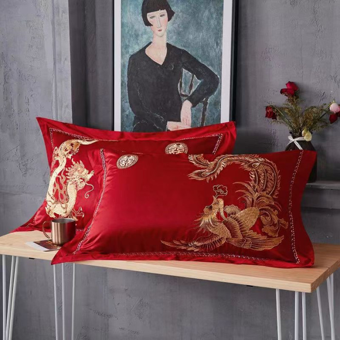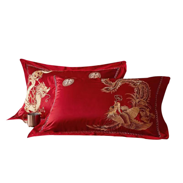 大紅婚慶枕套 重工刺綉龍鳳鴛鴦枕頭皮純棉貢緞結婚床品48*74陪嫁
