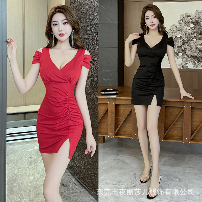 性感高彈低胸v領修身包臀短袖連衣裙打底短裙夜場性感顯瘦技師服