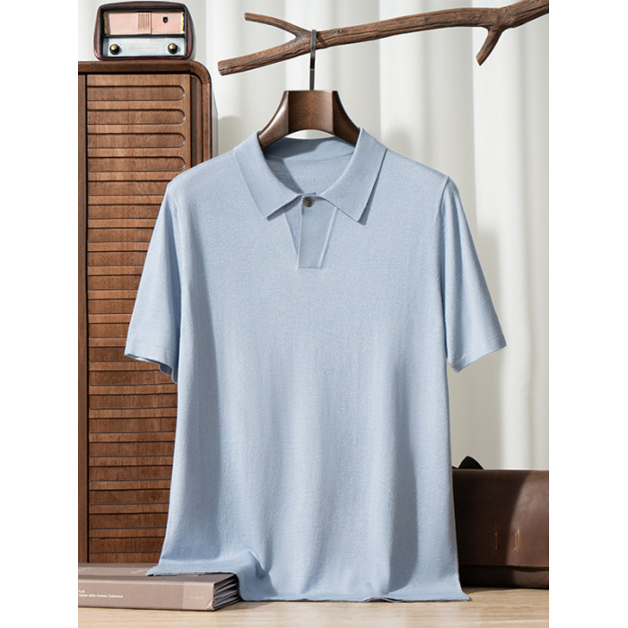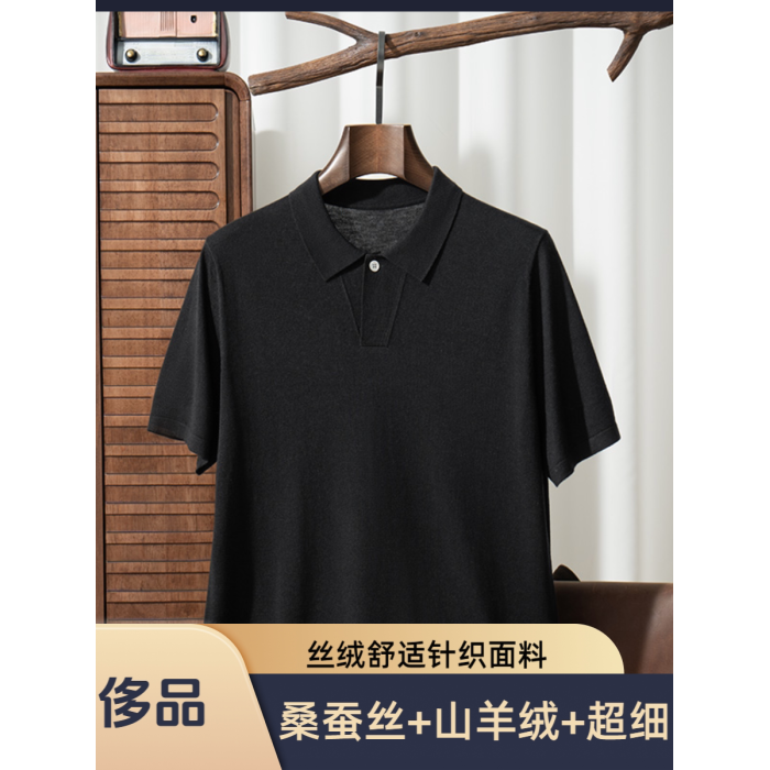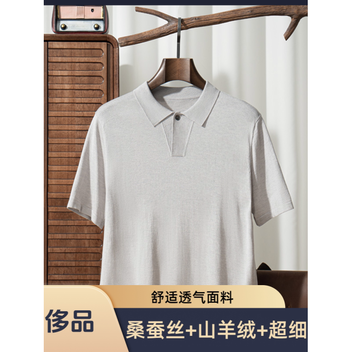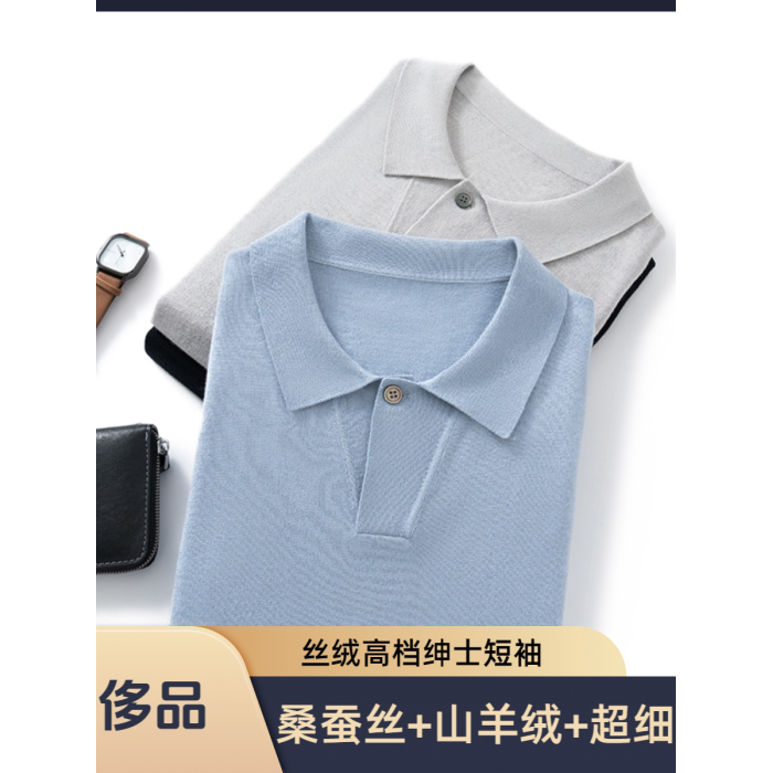 高級商務休閒桑蠶絲毛絨針織衫海鷗領男T恤春夏柔軟舒適短袖毛衣