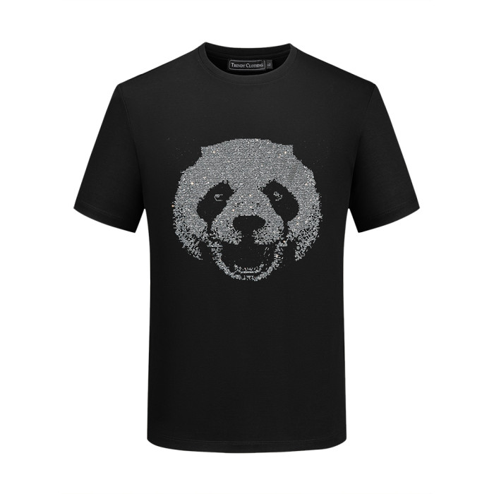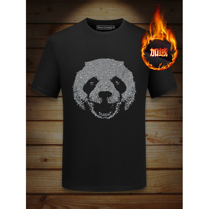 加絨打底衫男秋冬款2025新款燙鑽熊貓短袖男t恤潮牌大碼純棉半袖